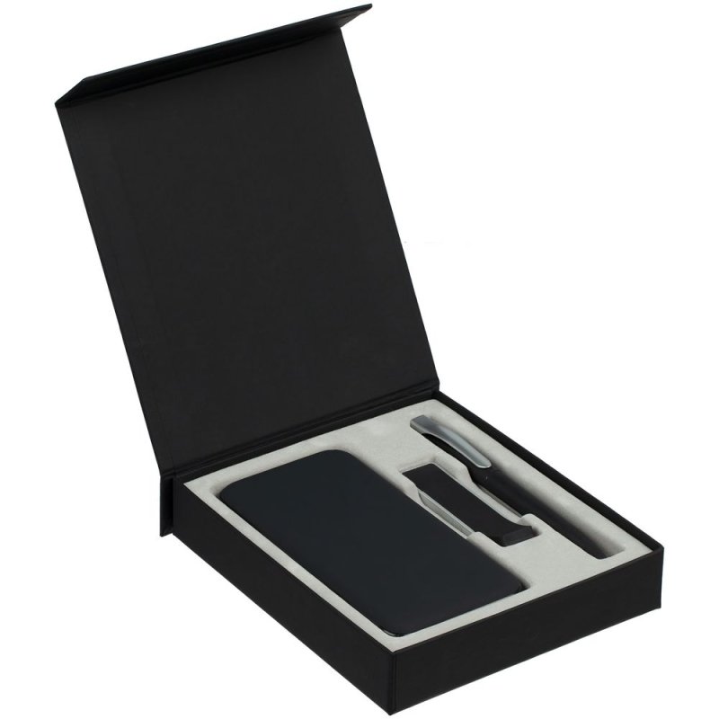 Подарочная коробка для аккумулятора 14,5х7,5х1,3 см, флешки 8,2х2,2х1,2 см и ручки 14,5х1,5х0,8 см с крышкой на магните и флокированным ложементом.