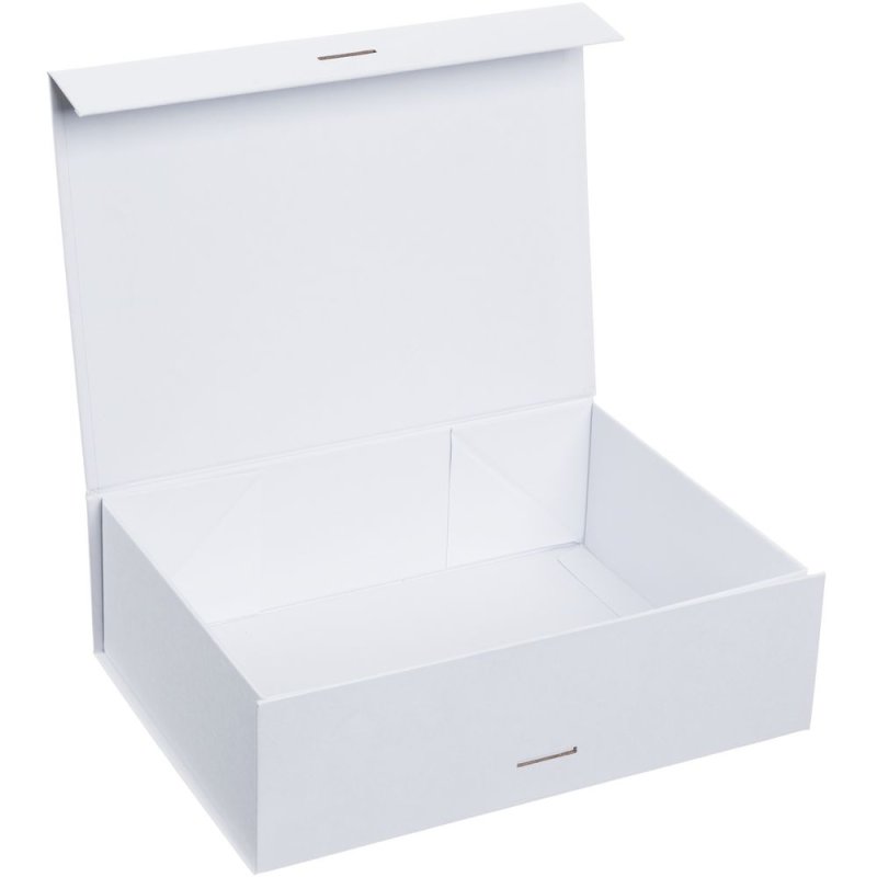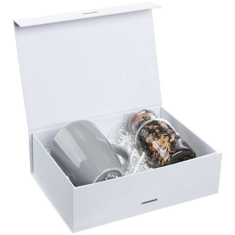 Коробка из переплетного картона, кашированного тонированной в массе крафтовой бумагой. Крышка на двух магнитах дополнительно фиксируется репсовой лентой.