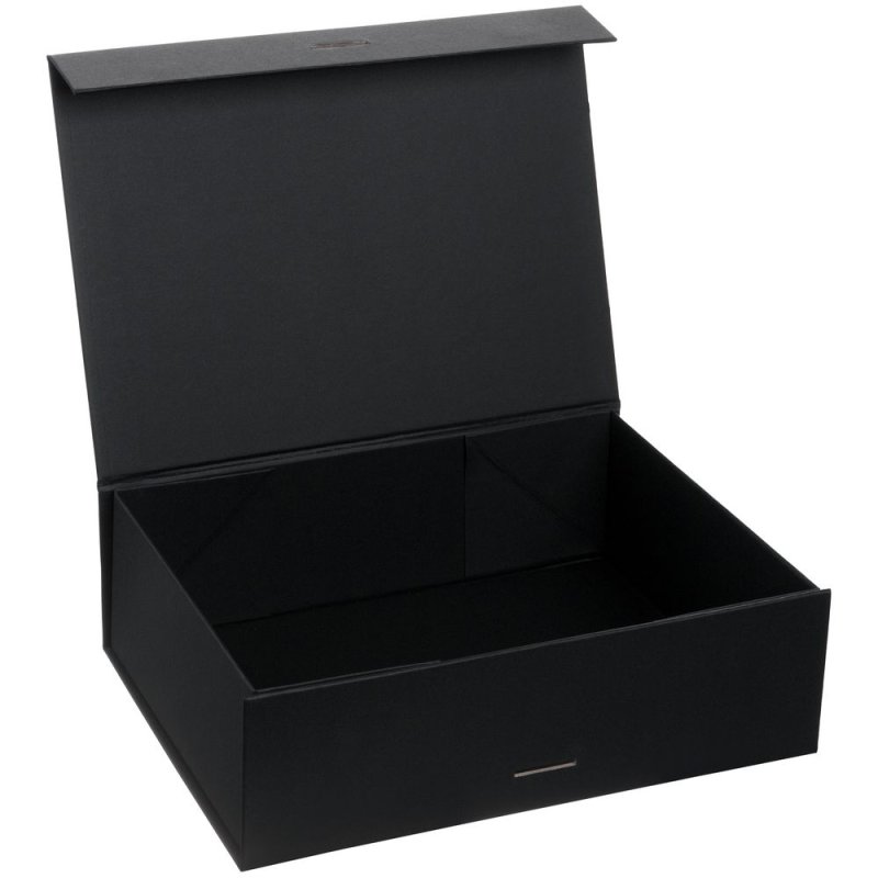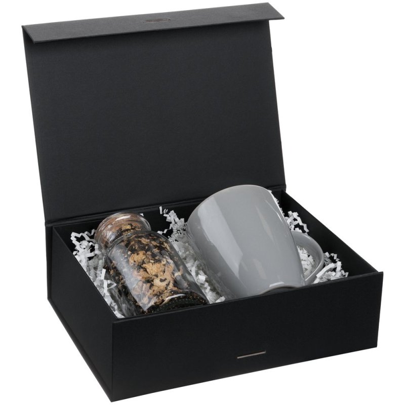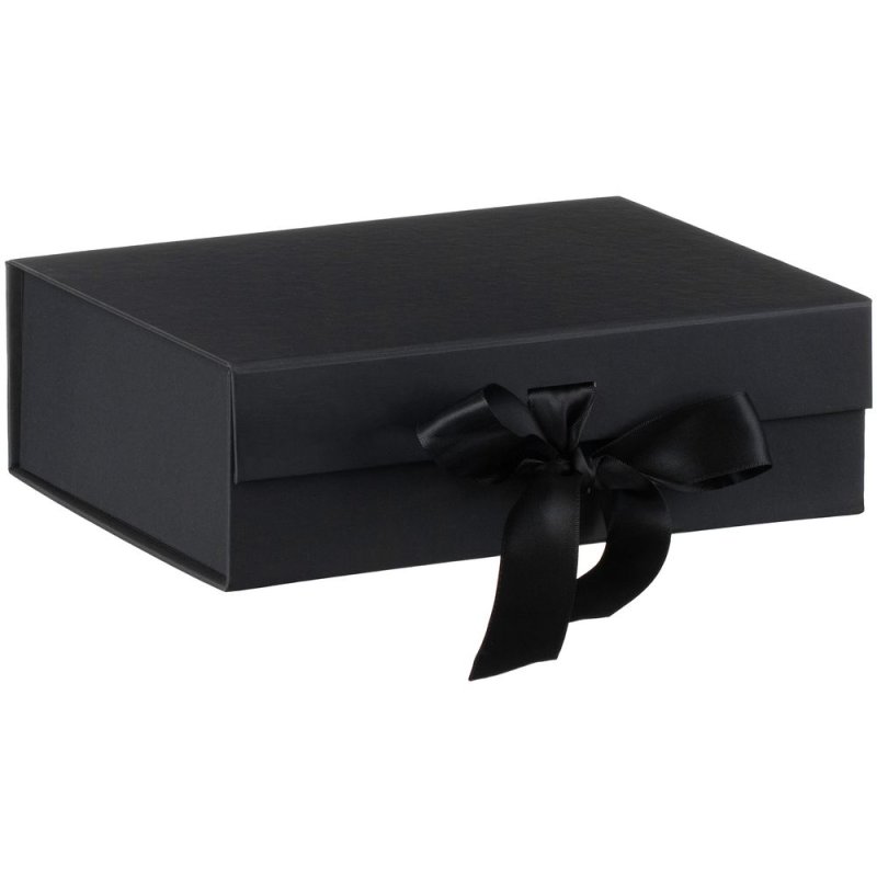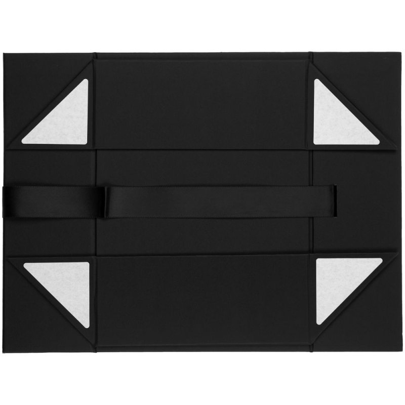 Коробка из переплетного картона, кашированного тонированной в массе крафтовой бумагой. Крышка на двух магнитах дополнительно фиксируется репсовой лентой.