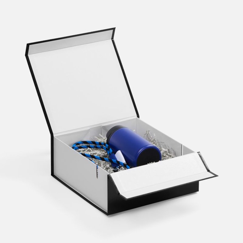 Плотная коробка из переплетного картона толщиной 2 мм с практичной конструкцией на двух створках. Складная система с уже нанесенным двусторонним скотчем позволяет быстро собрать коробку без дополнительных инструментов. Лайнер с полуглянцевым ламинированием устойчив к повреждениям и надолго сохраняет безупречный вид.