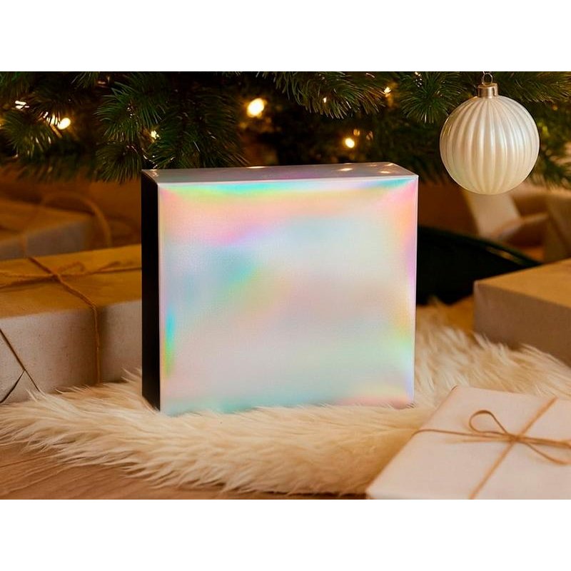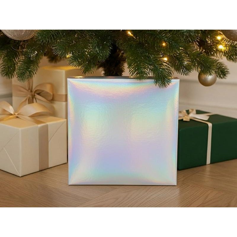 Подарочная коробка из прочного микрогофрокартона, кашированная бумагой с матовой ламинацией, выглядит элегантно и надёжно защищает содержимое. Новогодний голографический шубер с мерцающими серебристыми переливами придаёт ей праздничный блеск и делает каждый подарок по-настоящему особенным.
