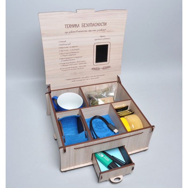 *Внимание! Цена указана без учета содержимого. На фото ‐ пример наполнения. Вложение может быть следующим: кружка, костеры, чай, сладости, карандашница, канцелярские принадлежности, электроника, мячик‐антистресс, и др.