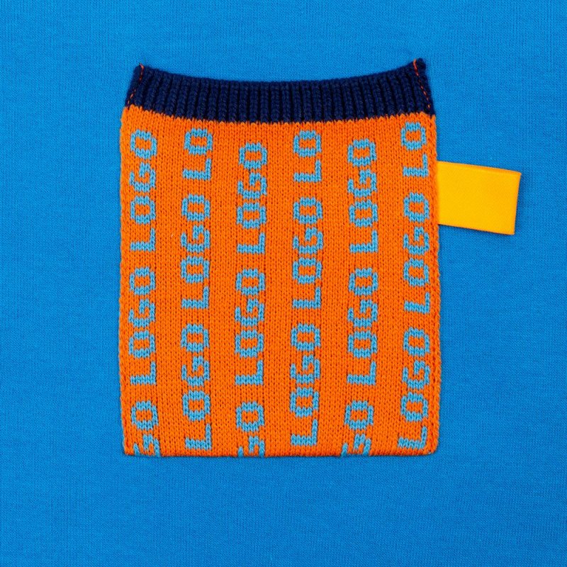 Вязаный карман с вывязанным логотипом или индивидуальным узором в фирменной цветовой гамме.