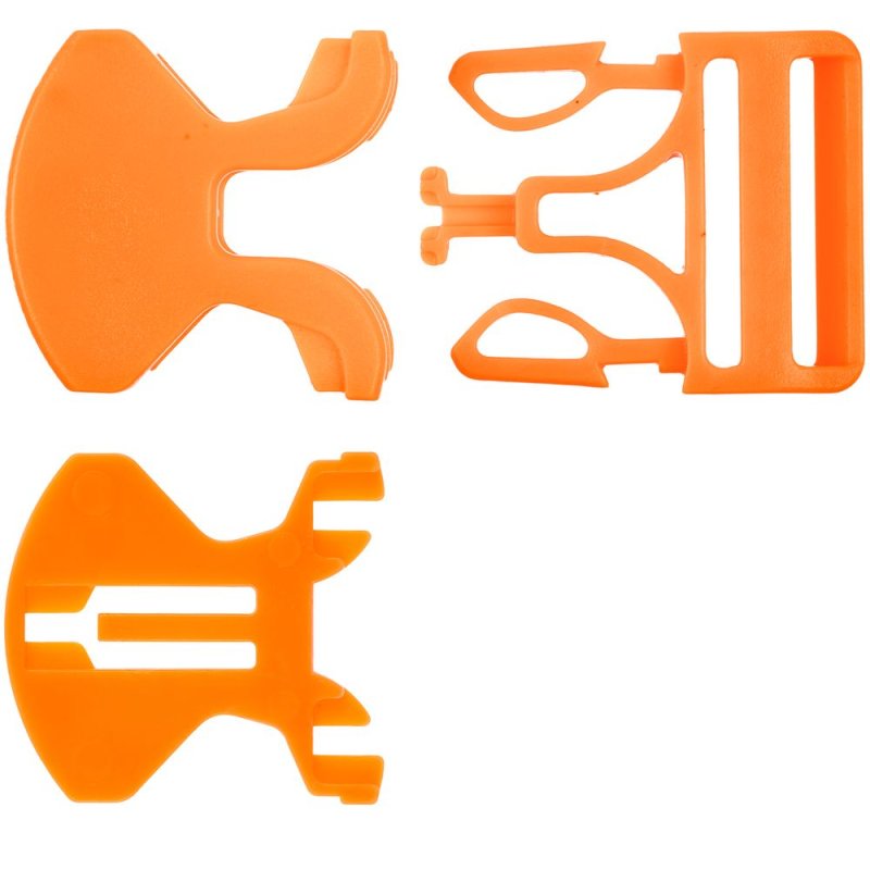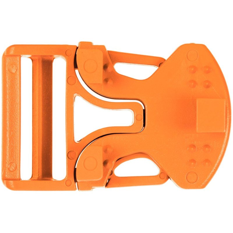 Особенность этой пряжки в том, что она состоит из 3 частей, две из которых крепятся напрямую на изделие, и для их установки необходим специальный инструмент. Третья деталь фиксируется на стропе.