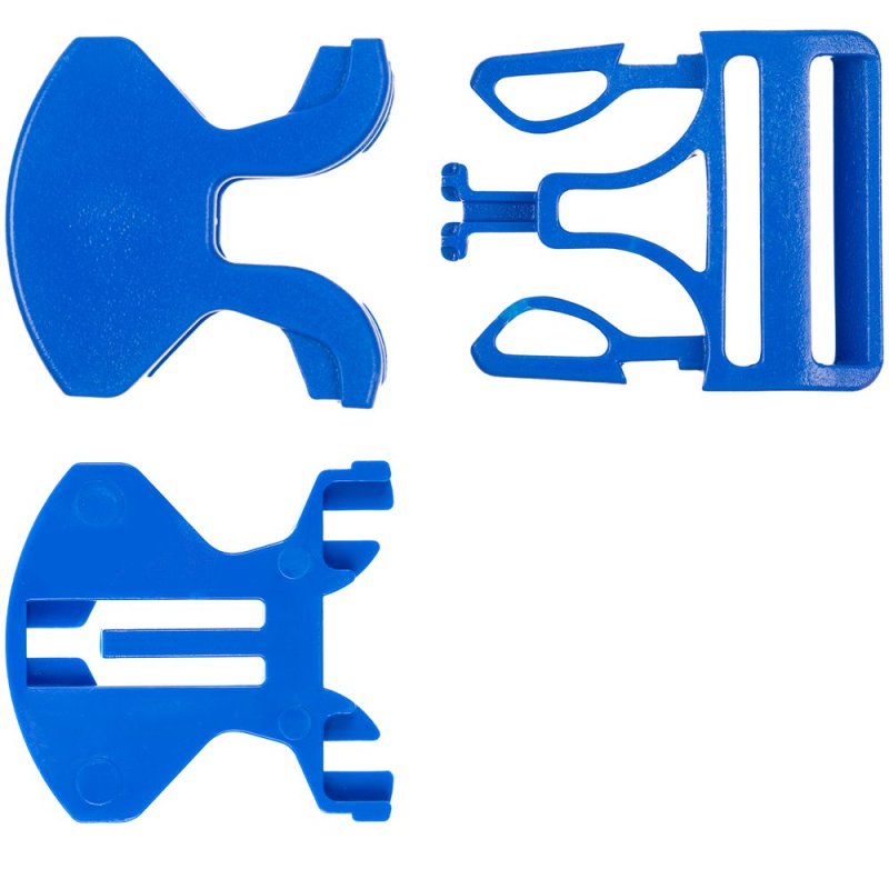 Особенность этой пряжки в том, что она состоит из 3 частей, две из которых крепятся напрямую на изделие, и для их установки необходим специальный инструмент. Третья деталь фиксируется на стропе.
