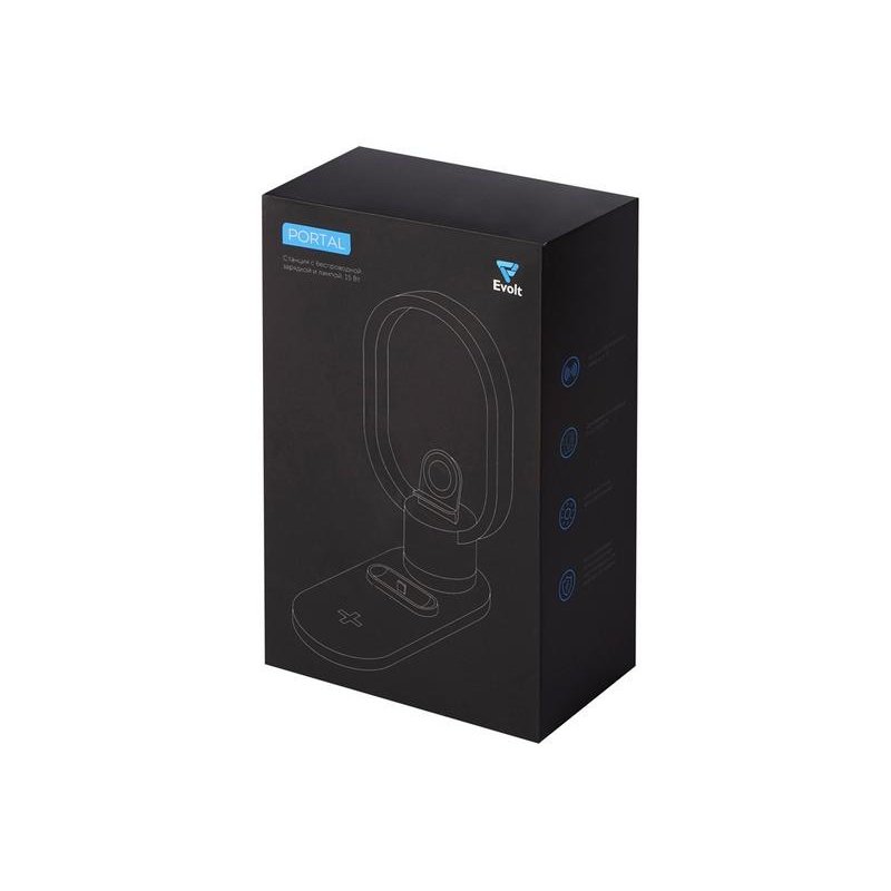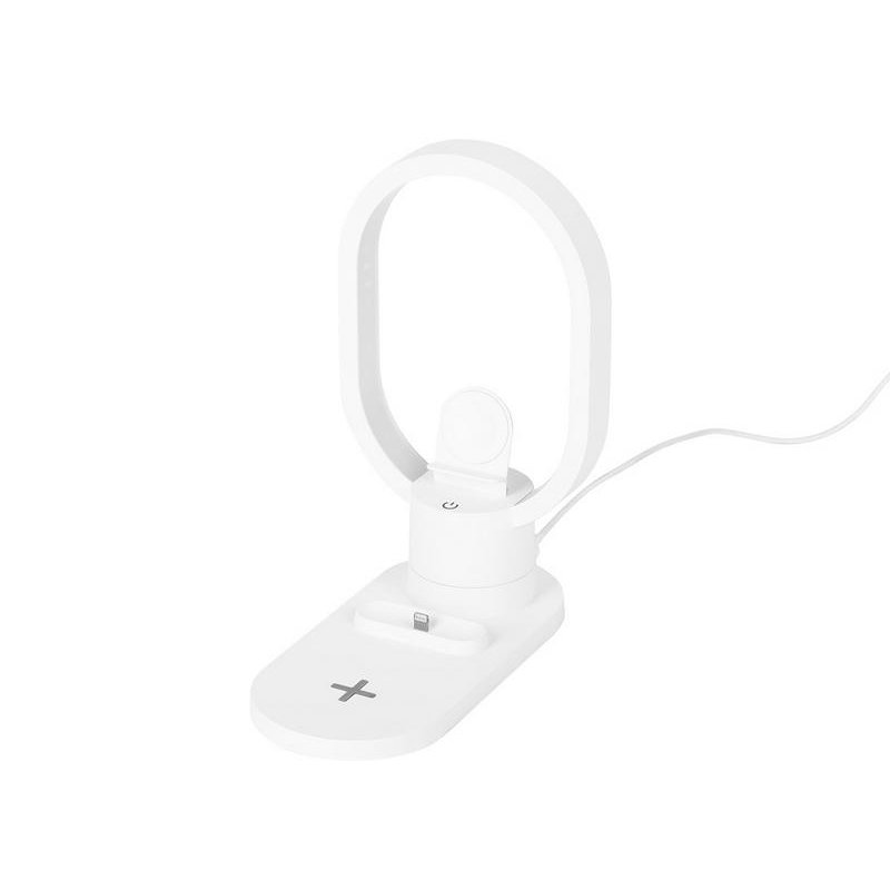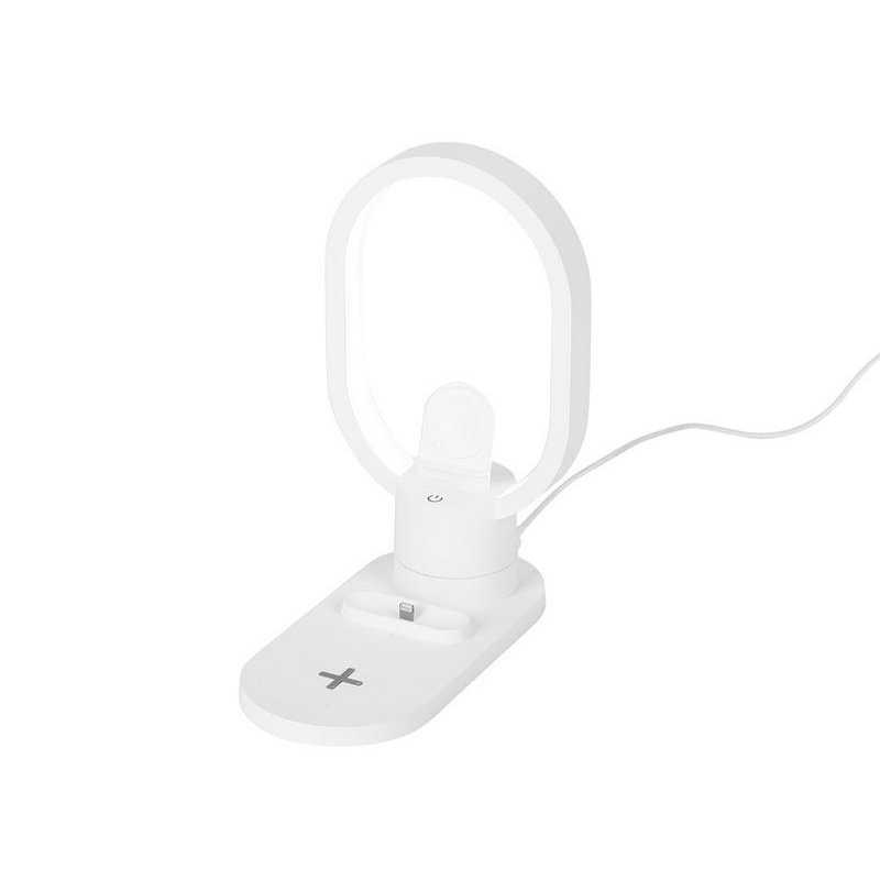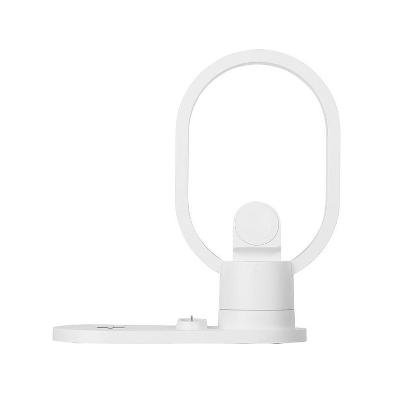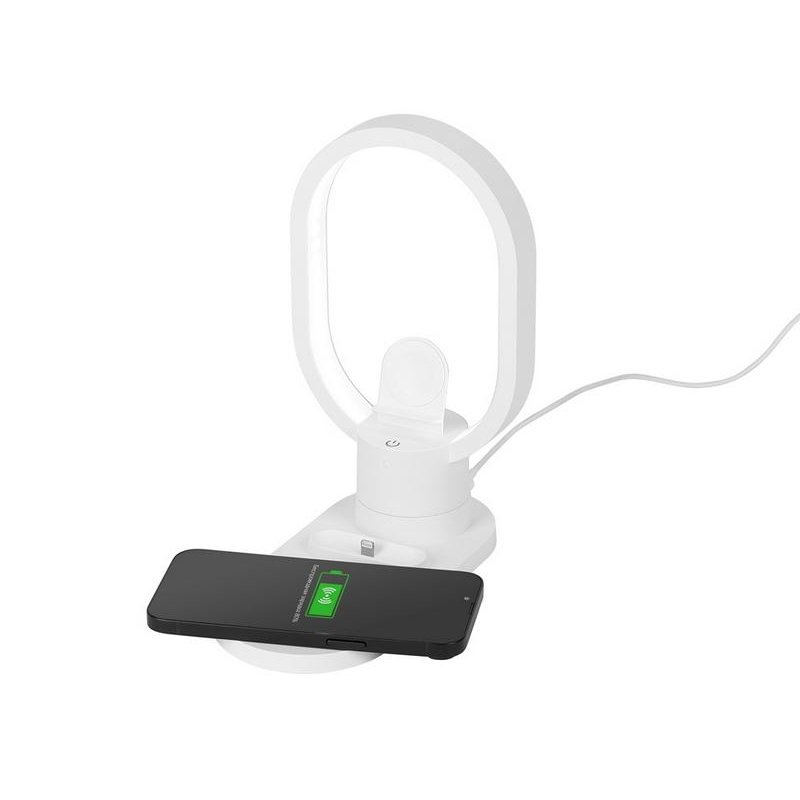 Настольная зарядная станцияс лампой для трёх устройств - смартфона с поддержкой беспроводной зарядки, часов Apple и наушников Apple (разъем Lightning). Регулируемый уровень яркости (диммер). Лампу можно вращать вокруг своей оси. Для удобства транспортировки лампу можно отсоединить.