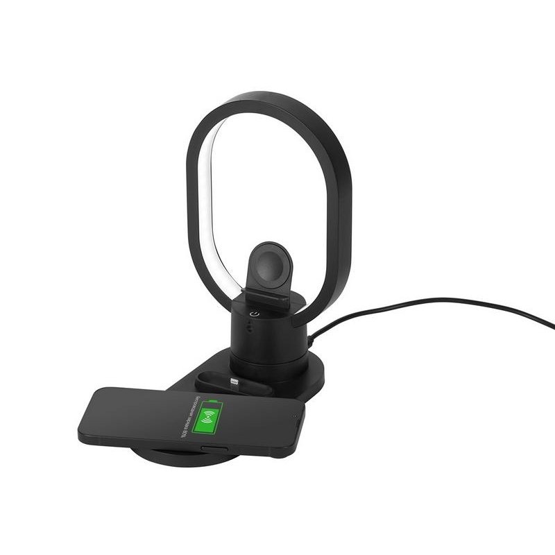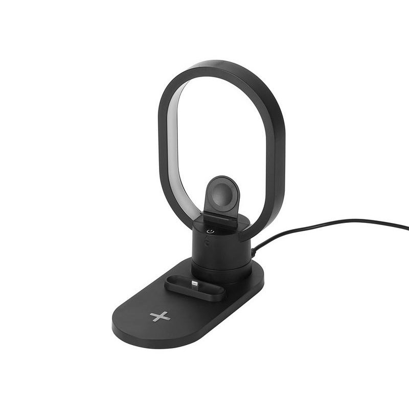 Настольная зарядная станцияс лампой для трёх устройств - смартфона с поддержкой беспроводной зарядки, часов Apple и наушников Apple (разъем Lightning). Регулируемый уровень яркости (диммер). Лампу можно вращать вокруг своей оси. Для удобства транспортировки лампу можно отсоединить.