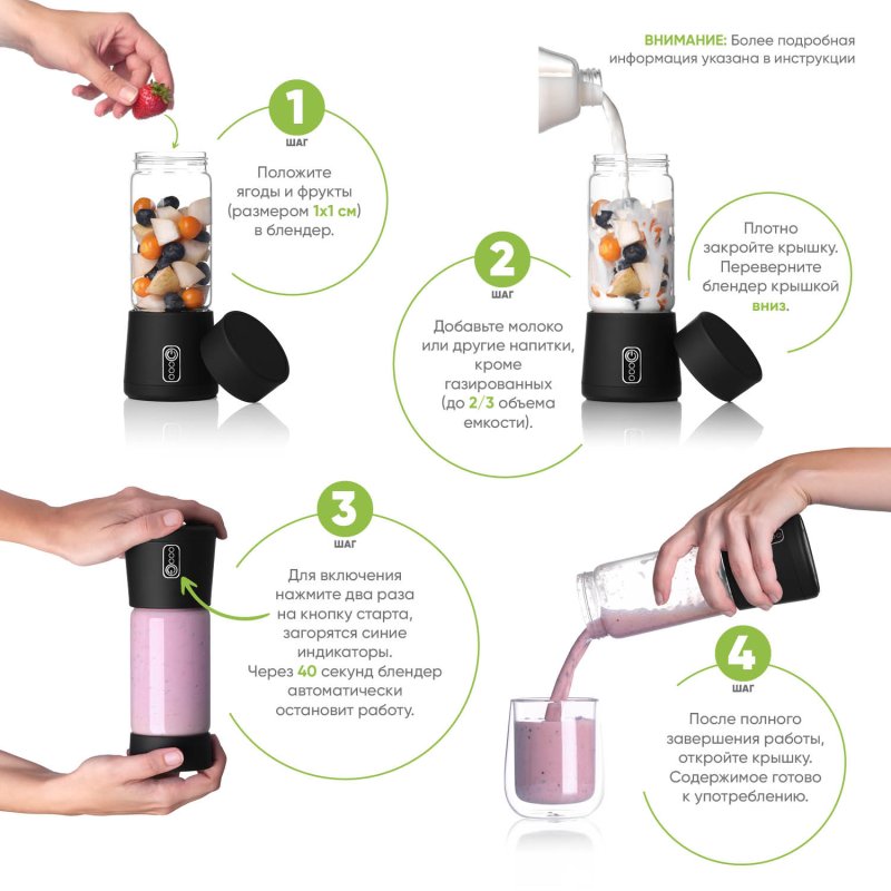 Перед первым использованием вымойте бутылку и основание блендера с помощью мягких моющих средств, далее насухо вытрите. Не оставляйте основание блендера надолго в воде.