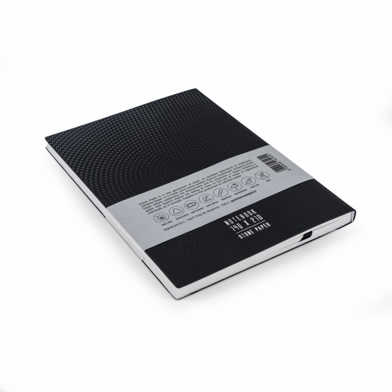 Тетрадь с листами из каменной бумаги. Дизайнеры Pininfarina создали элегантный дизайн для своего идеального дополнения к линейке вечных ручек Pininfarina Segno, так как именно на каменной бумаге они оставляют очень яркий след. Тетрадь размером А5 (14х21 см) в черной мягкой обложке с принтом Pininfarina и черным ляссе содержит 64 листа в линейку. Листы сделаны из каменной бумаги, экологической альтернативы обычной целлюлозной бумаге, которая не требует вырубки деревьев, использования воды и агрессивных химических веществ, тем самым защищая окружающую среду. Она состоит из 80% камня (карбоната кальция) и на 20% из связующего его нетоксичного полиэтилена высокой плотности (HDPE). Это бумага нового поколения с уникальными характеристиками. Каменная бумага на 100% водоотталкивающая, ее можно мыть. Жидкости, включая масло, не изменяют ее структуру, поскольку она не содержит древесных волокон, которые поглощают жидкости, в следствие чего традиционная бумага покрывается пятнами, деформируется и разрушается. Каменная бумага устойчива к разрыву, что также способствует ее долговечности. Она имеет приятный бархатистый эффект и не отражает свет. Плотность бумаги 140 гр/м2. Сделана в Италии.