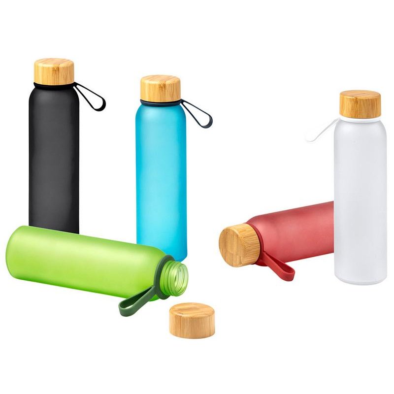 Полупрозрачная бутылка из переработанного стекла. Бамбуковая крышка с держателем. Объём: 500 мл. Поставляется в индивидуальной коробке.