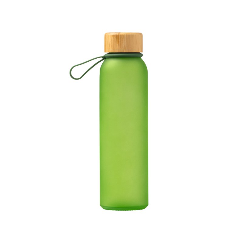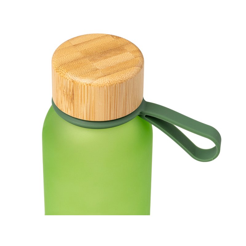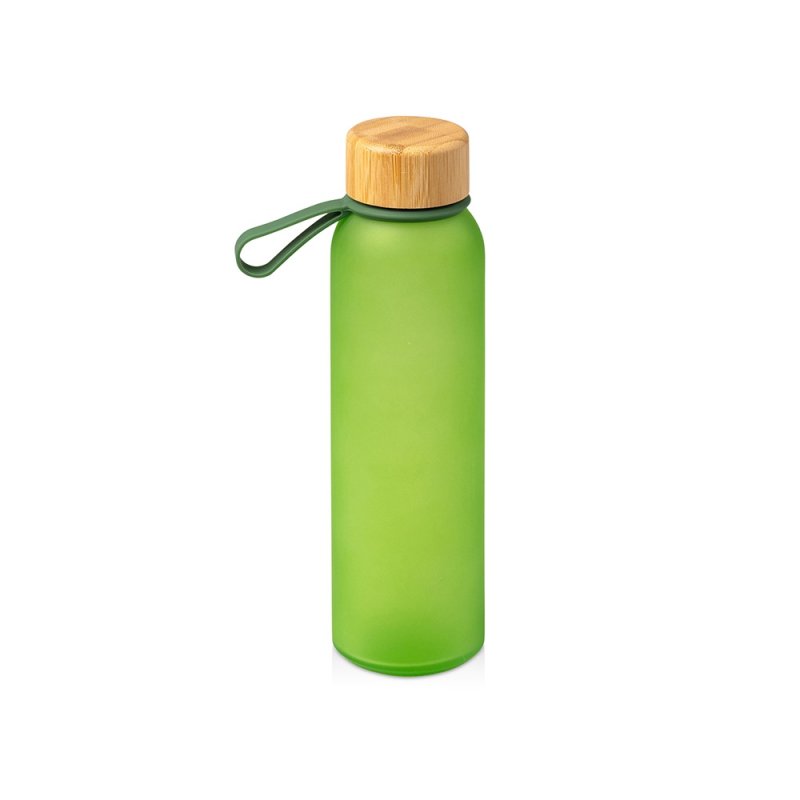 Полупрозрачная бутылка из переработанного стекла. Бамбуковая крышка с держателем. Объём: 500 мл. Поставляется в индивидуальной коробке.
