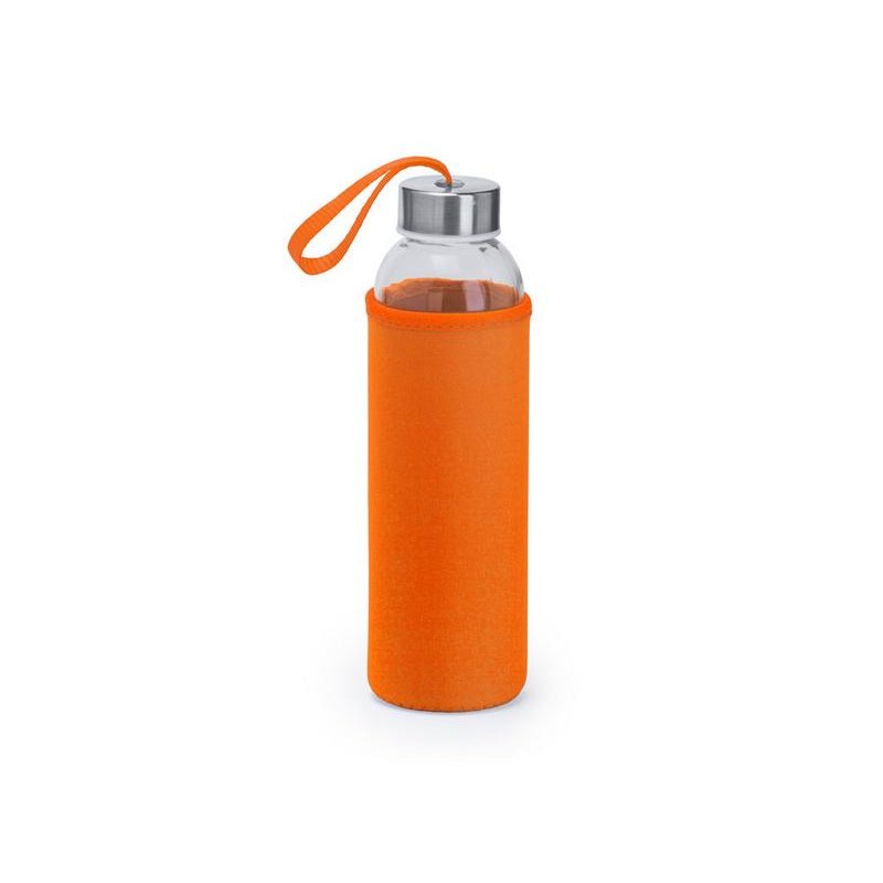 Стеклянная бутылка емкостью 500 мл, чехол из неопрена в сочетании с цветным ремешком для переноски.