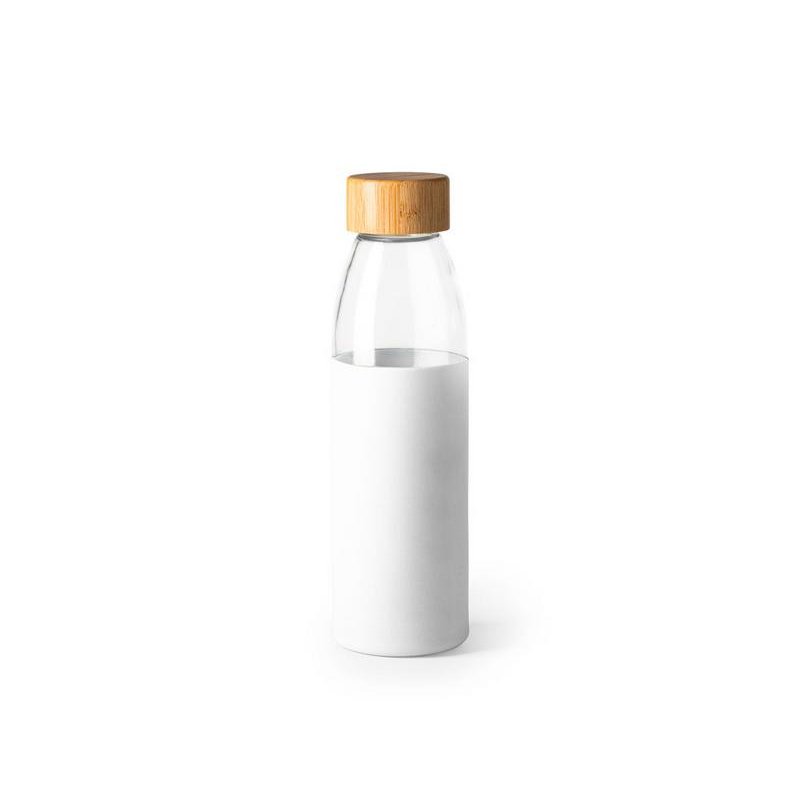 Стеклянная бутылка с бамбуковой пробкой и силиконовым чехлом пяти разных цветов. Объем 540 мл.
