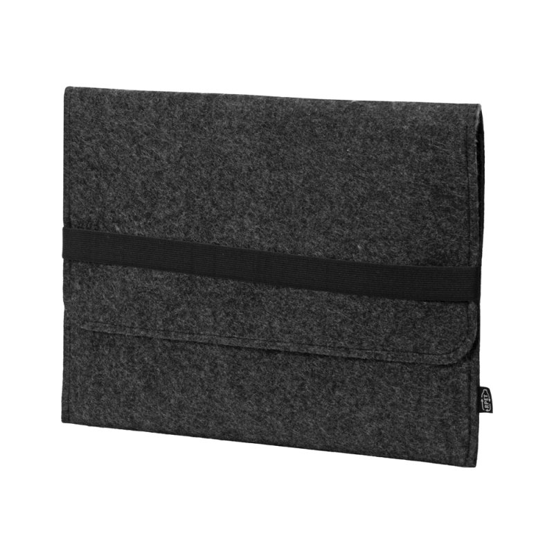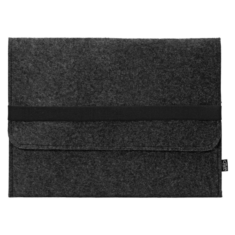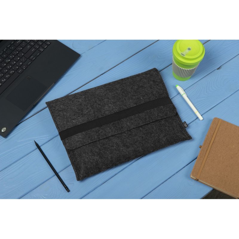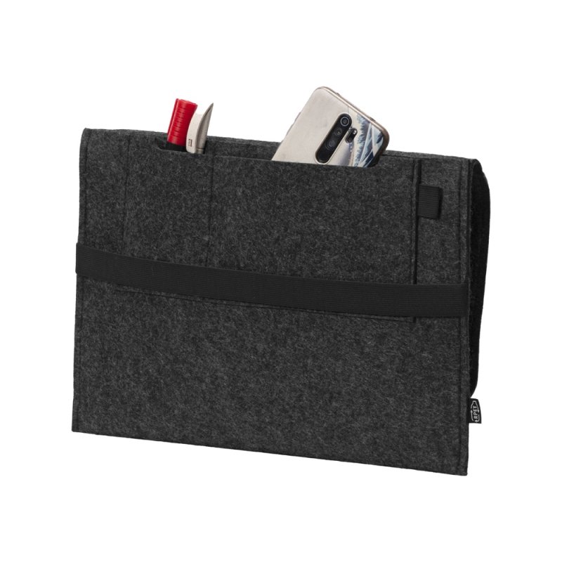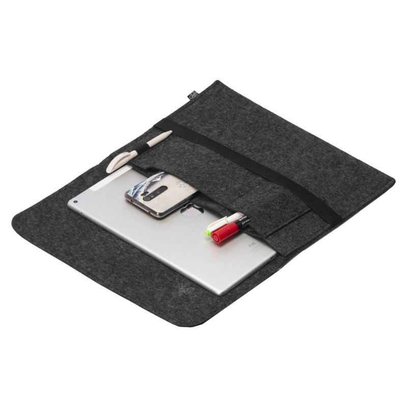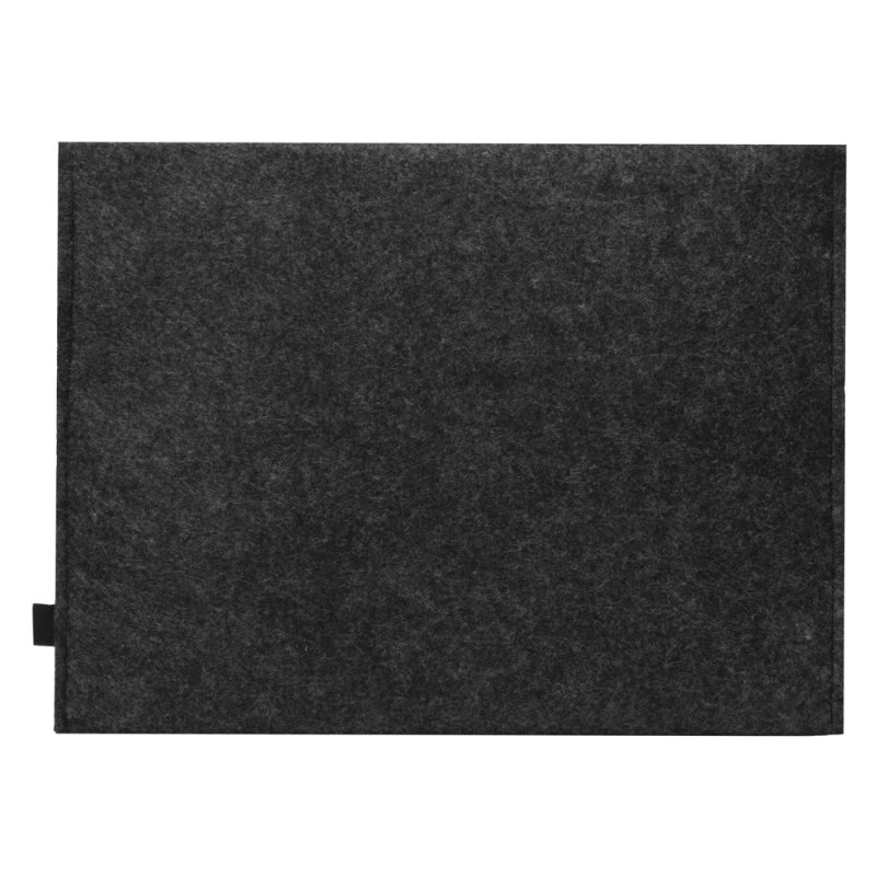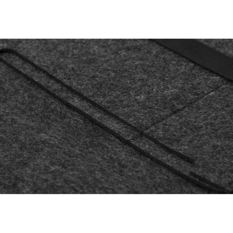 Чехол для ноутбука выполнен из фетра толщиной 3 мм. С передней стороны расположен органайзер размером 13x27 см для канцелярских принадлежностей, карт и телефона. Чехол фиксируется в закрытом виде с помощью эластичной ленты.
