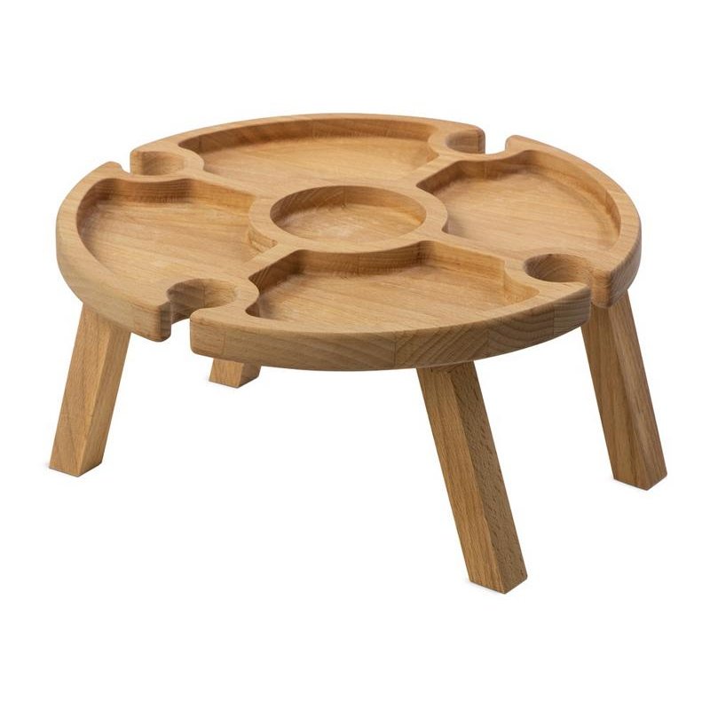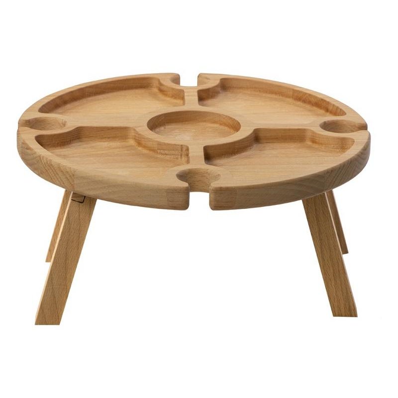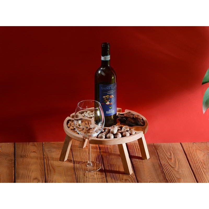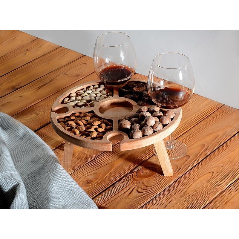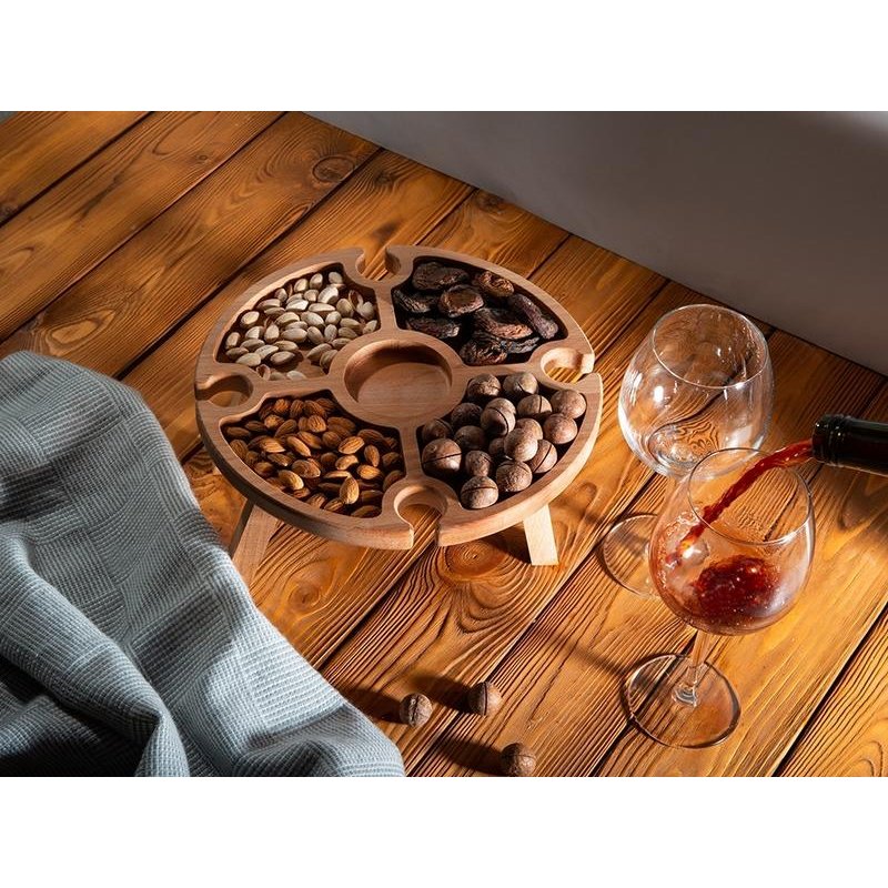 Деревянный столик на складных ножках может быть использован как во время пикников на открытом воздухе, так и дома, где его можно использовать прямо на полу. Столик позволяет подать 4 вида различных закусок, не смешивая их, благодаря четырем сепарированным секциям, в которые можно поместить ягоды, орехи и другие снеки, желательно, сухие либо подающиеся в масле (оливки, маслины). Четыре держателя для бокала особенно актуальны во время отдыха на природе, где каждый участник пикника обязательно оценит возможность зафиксировать посуду для вина.