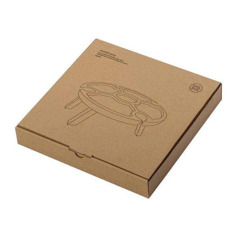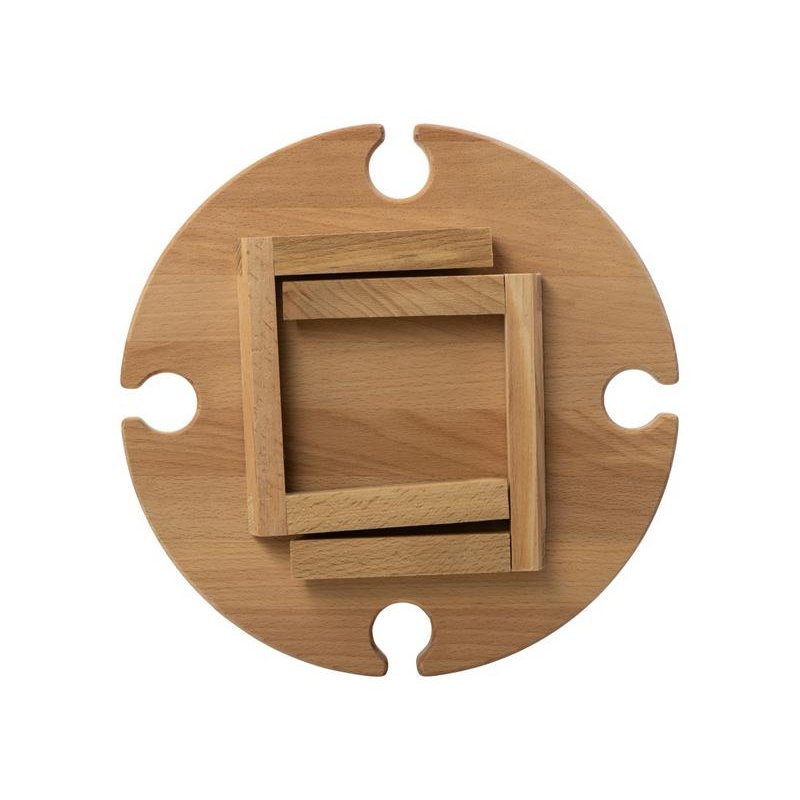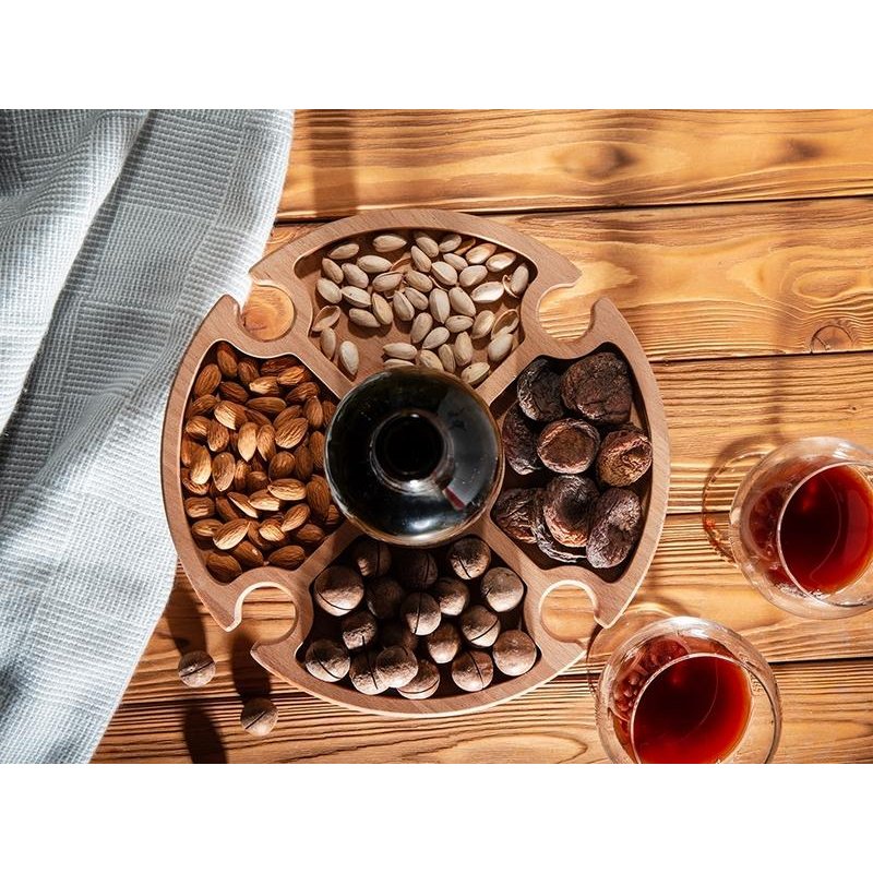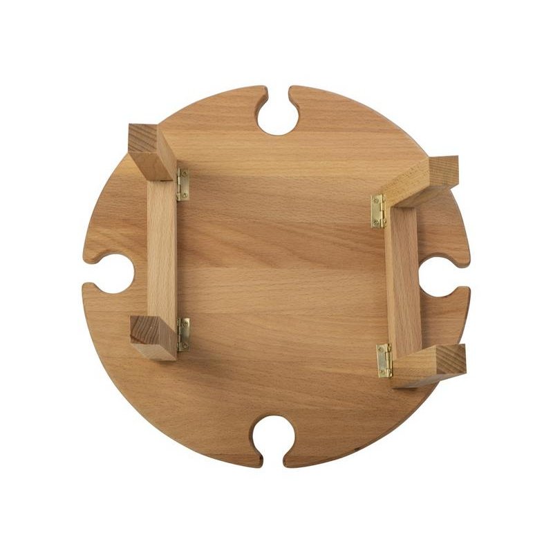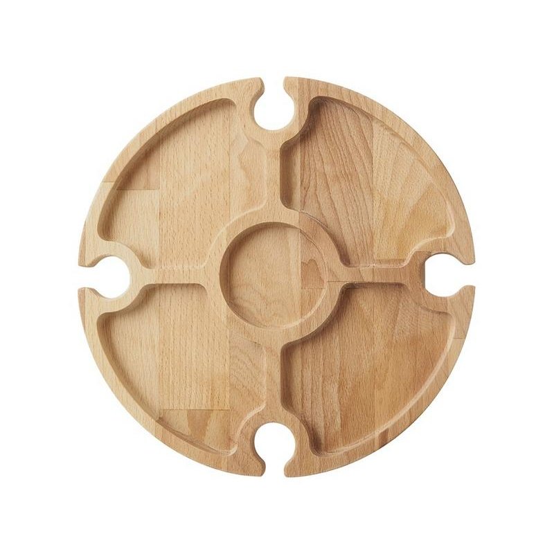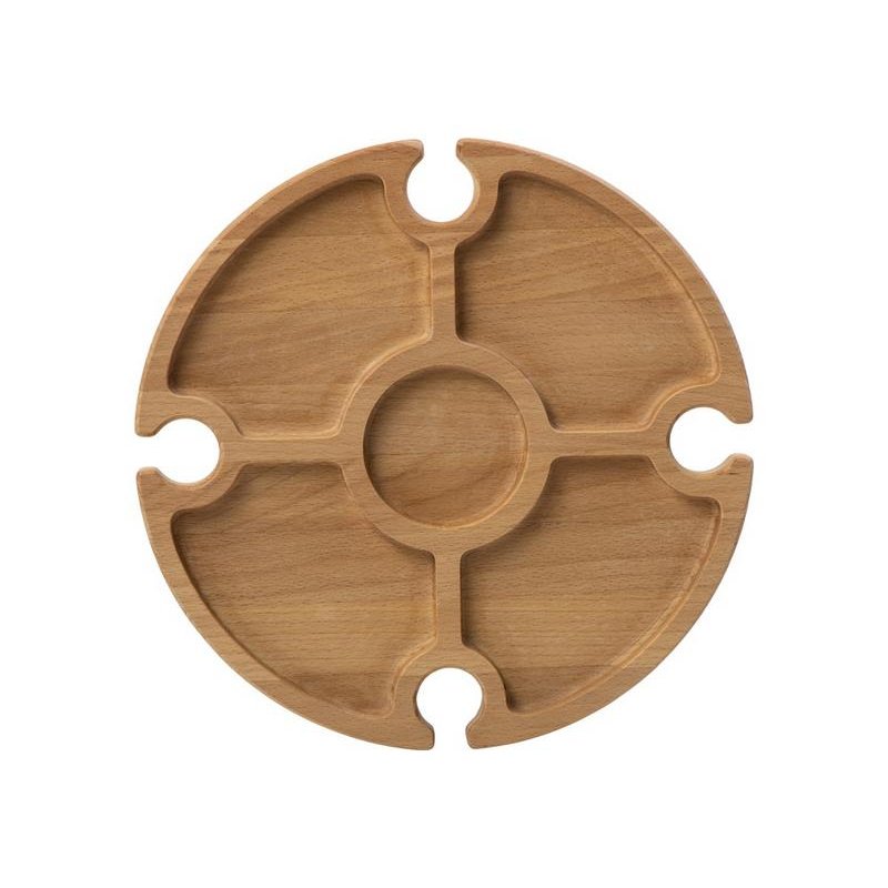 Деревянный столик на складных ножках может быть использован как во время пикников на открытом воздухе, так и дома, где его можно использовать прямо на полу. Столик позволяет подать 4 вида различных закусок, не смешивая их, благодаря четырем сепарированным секциям, в которые можно поместить ягоды, орехи и другие снеки, желательно, сухие либо подающиеся в масле (оливки, маслины). Четыре держателя для бокала особенно актуальны во время отдыха на природе, где каждый участник пикника обязательно оценит возможность зафиксировать посуду для вина.
