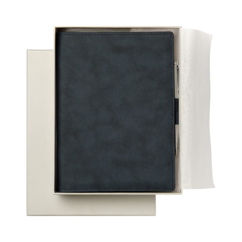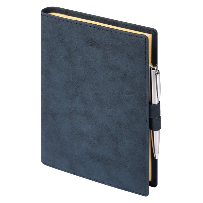 В комплекте с ежедневником-портфолио Clip NEO синего цвета поставляется элегантная шариковая ручка Sonata PB серебряного цвета.
