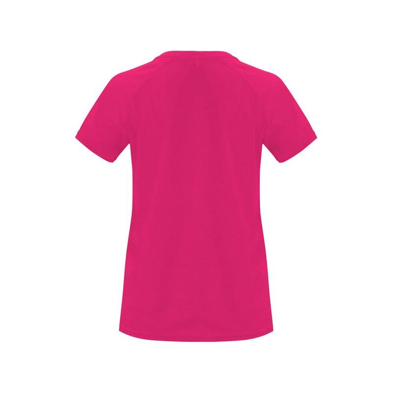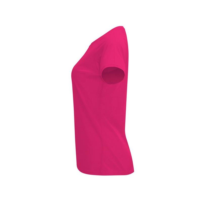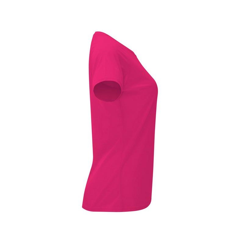 Спортивная футболка с коротким рукавом реглан для женщин. Круглый вырез горловины с отделкой плоским швом. Рукав сложного кроя для обеспечения дополнительного удобства при занятиях спортом. Отделка плоским швом с застилом по пройме и рукавам.