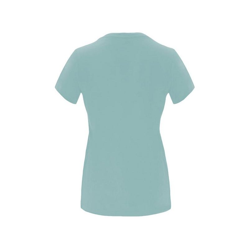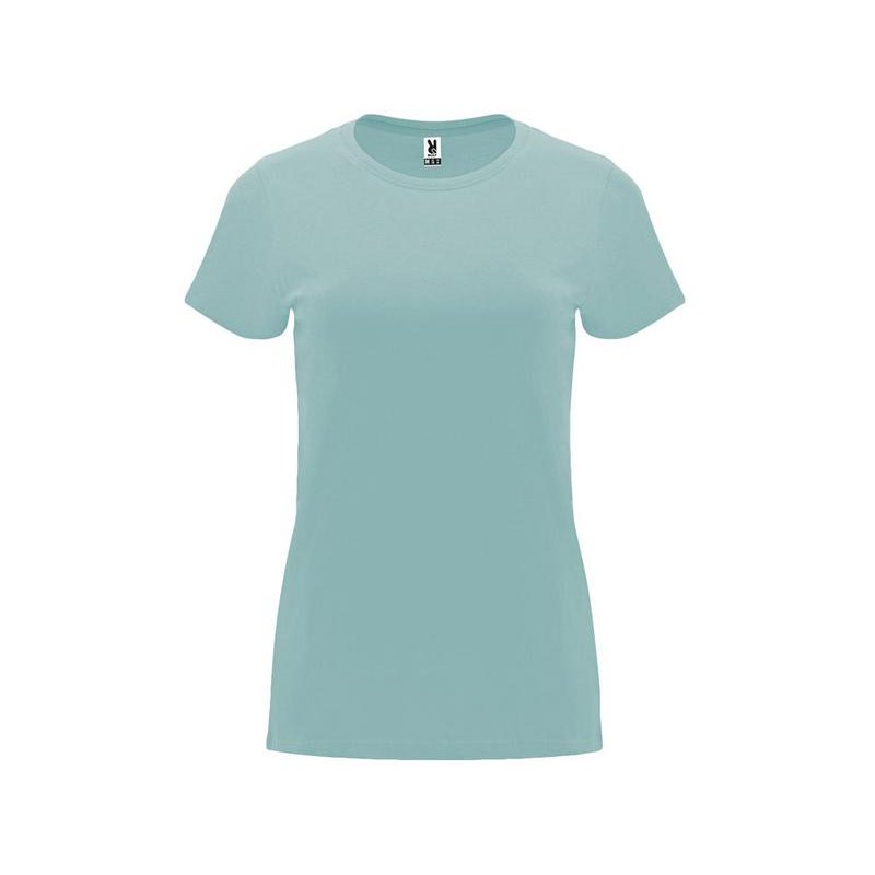 Женская приталенная футболка. Круглый вырез горловины обработан рибом 1х1. Шов горловины укреплен тесьмой.
