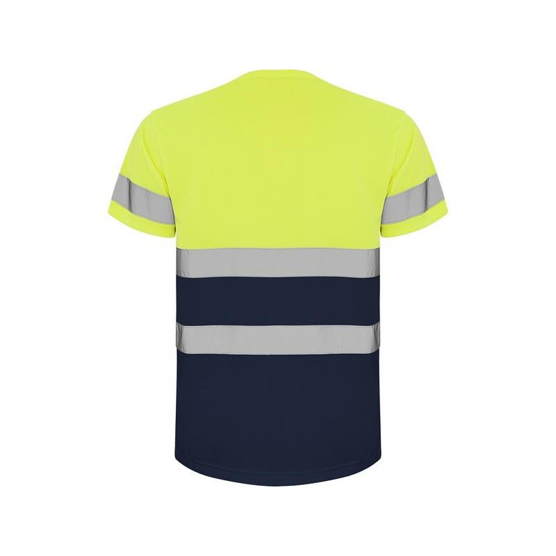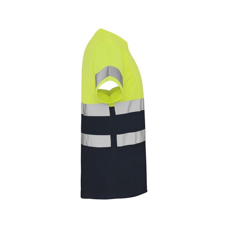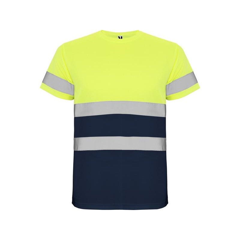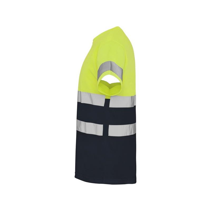 Футболка со светоотражающими элементами с короткими рукавами. Круглая горловина из той же ткани, с усиленными закрытыми швами на внутренней стороне горловины. Две горизонтальные светоотражающие полосы на туловище и одна светоотражающая полоса на рукавах.