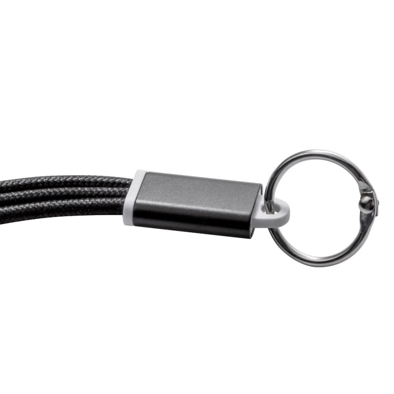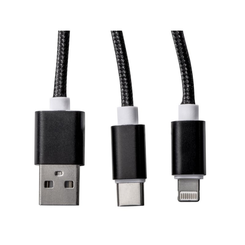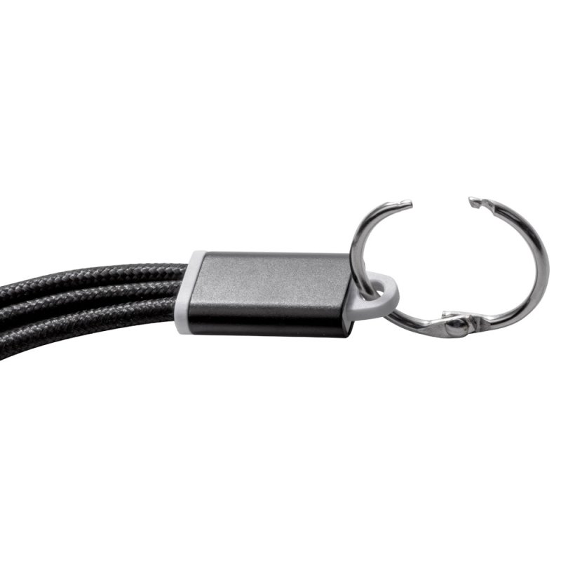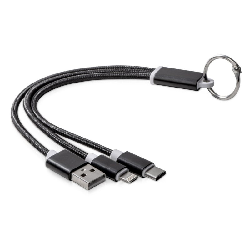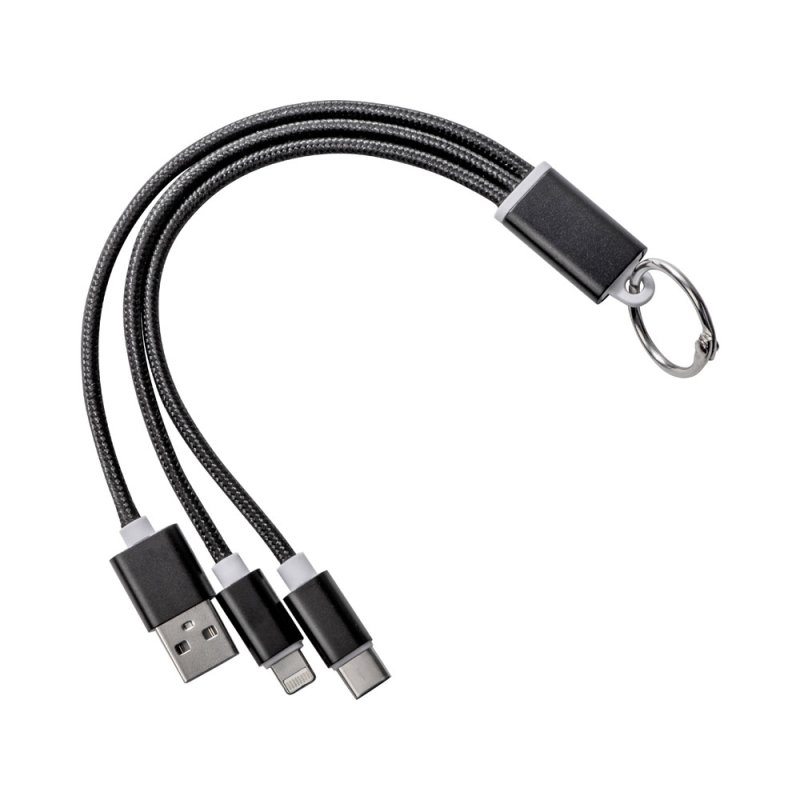 Кабель для зарядки Tres 3-в-1 с брелоком, коннекторами 1 type с, 1 USB type A и двойным совместимым коннектором 2-в-1 для устройств с ОС Apple® iOS и Android. В комплект входит брелок. Для зарядки устройств Apple подключайте кабель стороной без контактов; для зарядки устройств с ОС Android подключайте кабель стороной с контактами. Алюминий.
