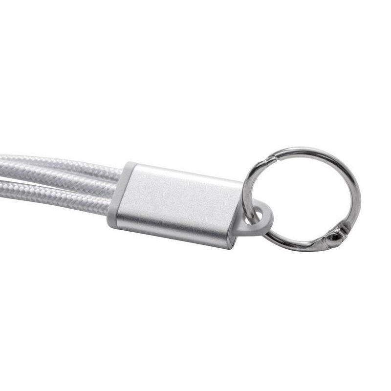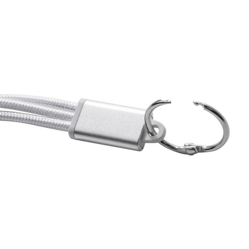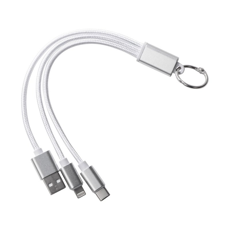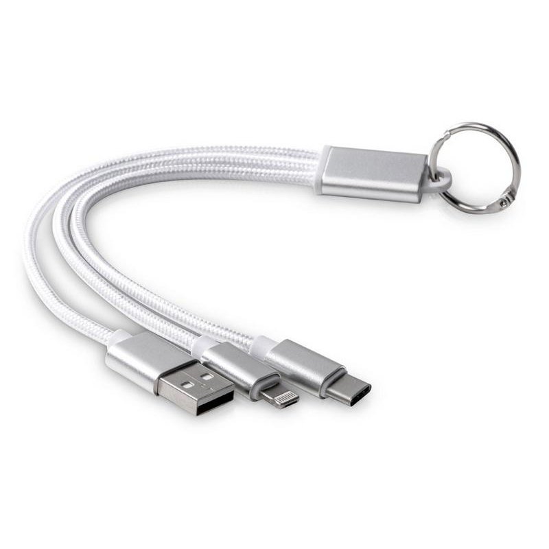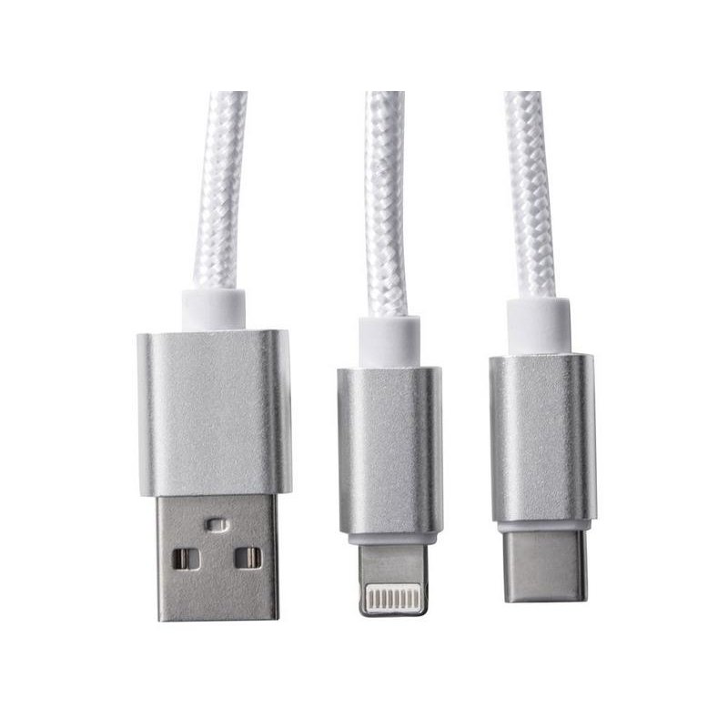 Кабель для зарядки Tres 3-в-1 с брелоком, коннекторами 1 type с, 1 USB type A и двойным совместимым коннектором 2-в-1 для устройств с ОС Apple® iOS и Android. В комплект входит брелок. Для зарядки устройств Apple подключайте кабель стороной без контактов; для зарядки устройств с ОС Android подключайте кабель стороной с контактами. Алюминий.