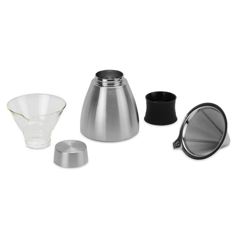 Кофеварка состоит из емкости, куда попадает приготовленный кофе, уже упомянутого сетчатого фильтра из нержавеющей стали, и воронки из термостойкого боросиликатного стекла, в которую фильтр вставляется. Конструкция кофеварки полностью разборная, ее легко мыть, сушить и разбирать.