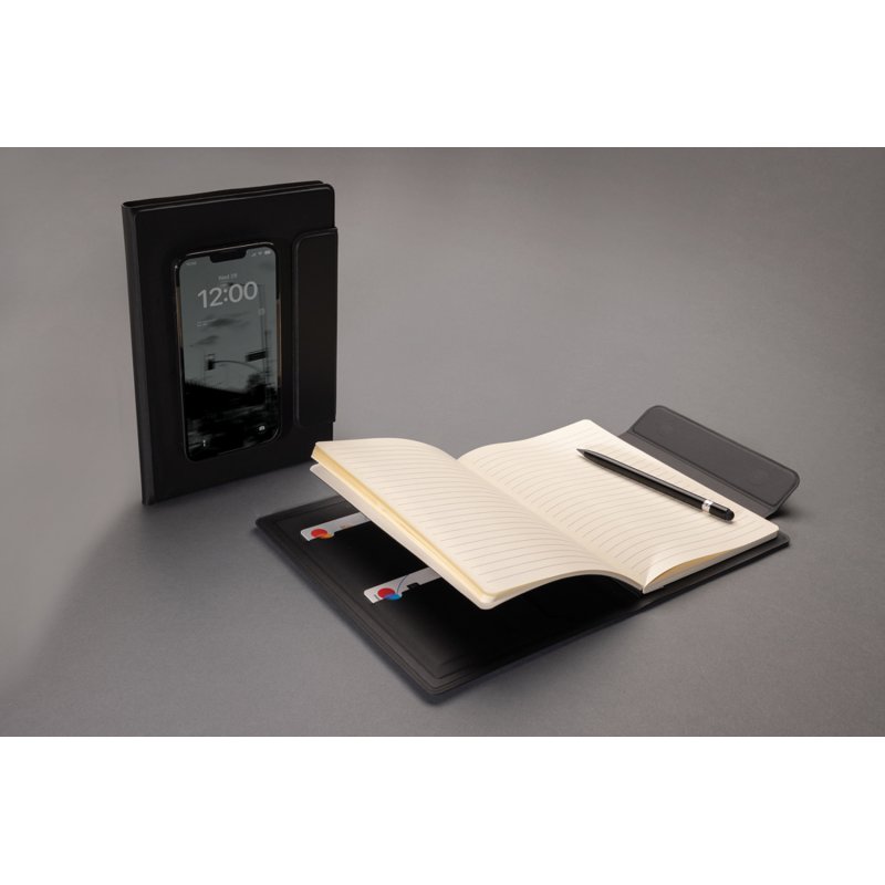 Органайзер Stuart формата А5 выполнен из переработанного полиуретана и оснащен магнитным держателем для телефона (подходит для смартфонов, поддерживающих функцию MagSafe). Внутри — блокнот формата А5 с линованными листами из кремовой бумаги, сертифицированной FSC® (64 листа плотностью 80 г/м²). Есть два отделения для визитных карточек и карман для документов. Оригинальный подарок для бизнес-партнеров и коллег.