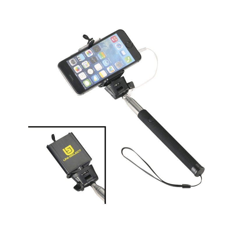 Проводной монопод. Сделайте идеальный селфи с этим выдвижным моноподом (до 90 см). Не требует батареи или использования приложения. Просто подключите 3,5 мм аудио разъем в телефон (совместим только с телефонами, у которых есть разъем 3.5 мм) и нажмите на кнопку, расположенную на ручке. Регулируемый держатель. Силикон, сталь и ПВХ.