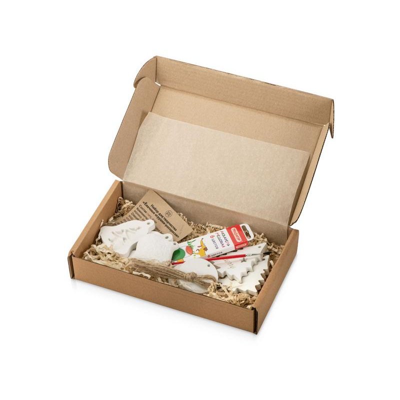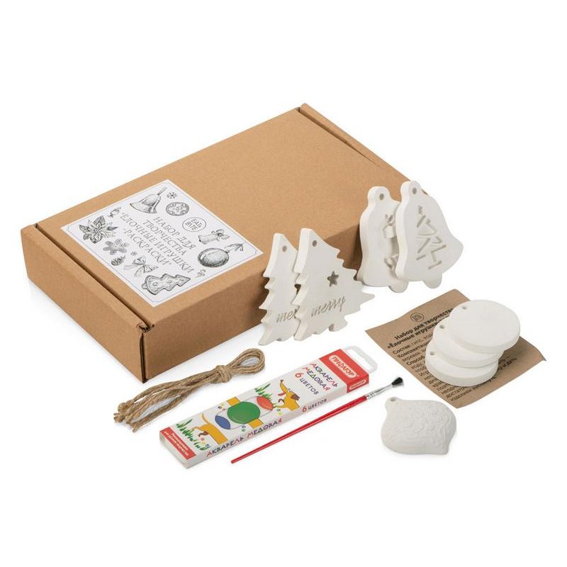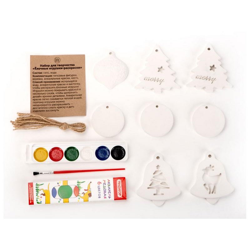 Мы подготовили готовый творческий набор, состоящий из игрушек, выполненных их гипса, кисти и акварельных красок.