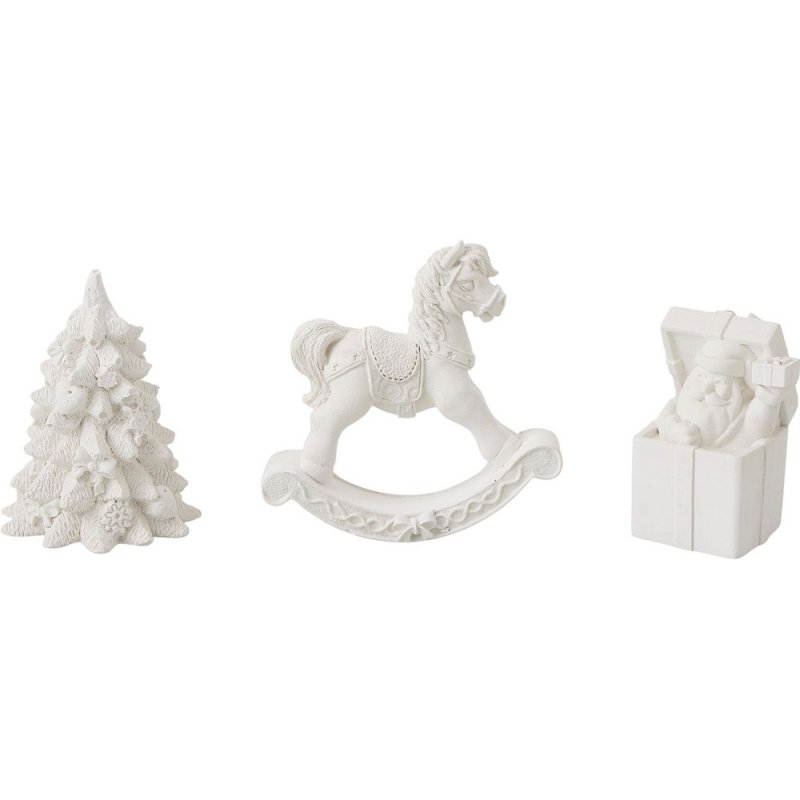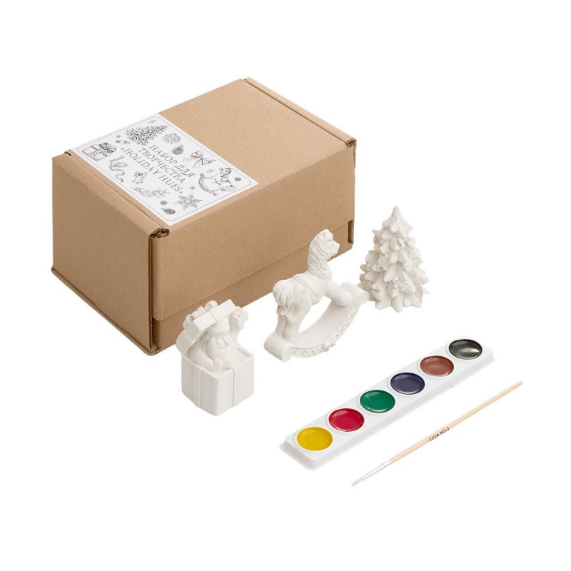 В набор входят три гипсовых фигурки — лошадка-качалка, елочка и подарочная коробка с Дедом Морозом, а также акварельные краски и кисть.