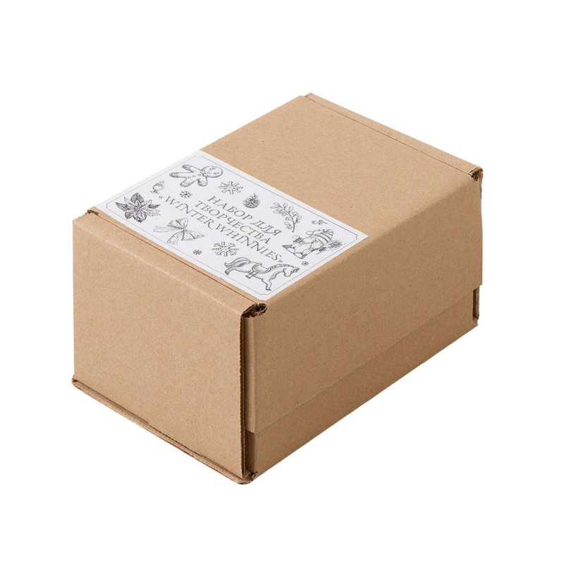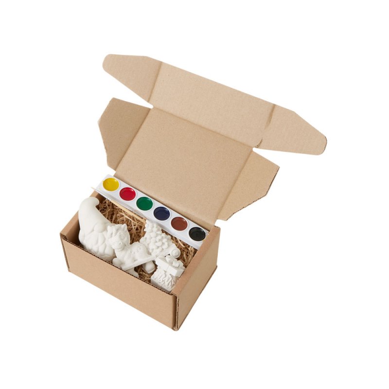 В набор входят три гипсовых фигурки — лошадка елочкой, гном подарочная коробка с пряничными человечками, а также акварельные краски и кисть.