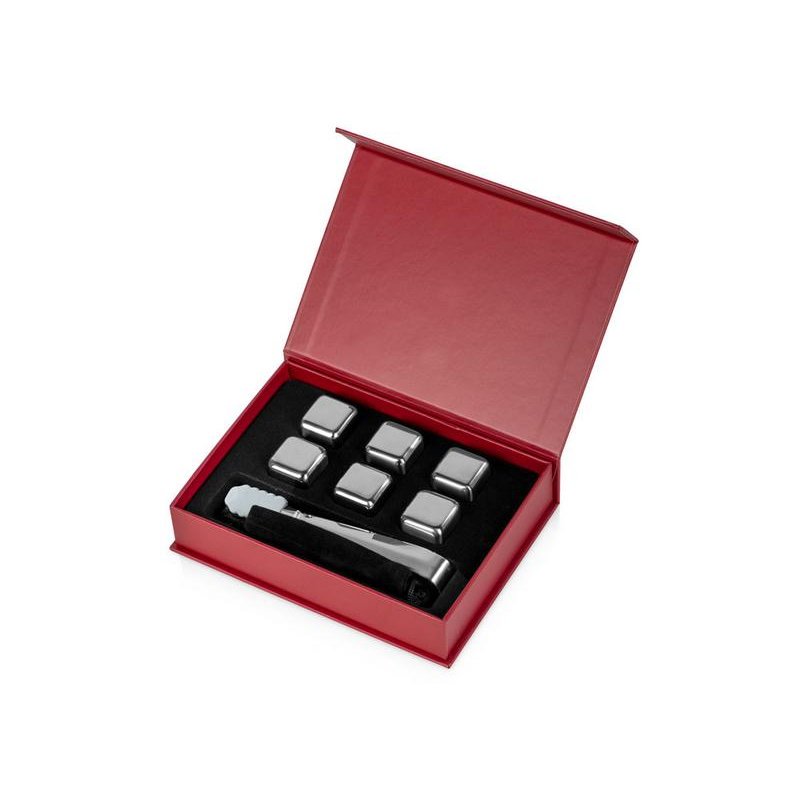 Набор для виски Skye состоит из шести охлаждающих камней из нержавеющей стали, бархатистого мешочка и удобных щипцов. Сет упакован в качественную коробку с магнитной крышкой винного цвета, а сверху надевается шубер с полиграфией, который можно заменить на какой-либо другой.