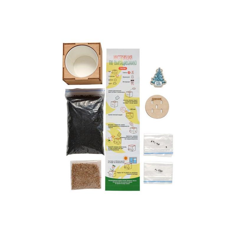 Набор включает: кубический горшок из натуральной берёзовой древесины, семена и специальный питательный грунт, подходящий для конкретного сорта.
