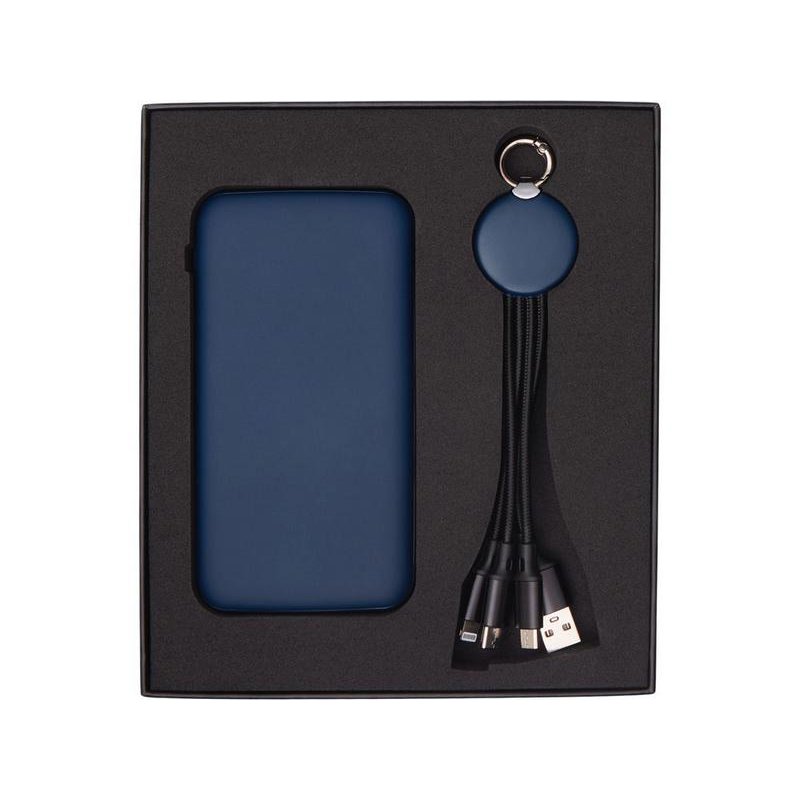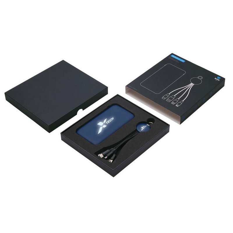 Практичный и стильный набор для зарядки в дороге: внешний аккумулятор на 10 000 мА·ч и универсальный кабель с тремя разъёмами (Micro USB, Lightning, USB Type-C). Оба элемента комплекта оснащены подсветкой логотипа — ваш бренд всегда на виду, даже в темноте. Повербанк обеспечивает 2–3 полных заряда смартфона и оснащён двумя выходами (USB-A и USB-C) для одновременной зарядки двух устройств. Поставляется в прочной подарочной коробке с шубером— идеальное решение для корпоративных подарков.