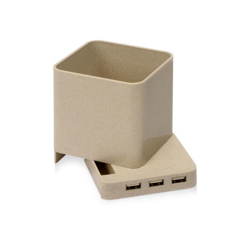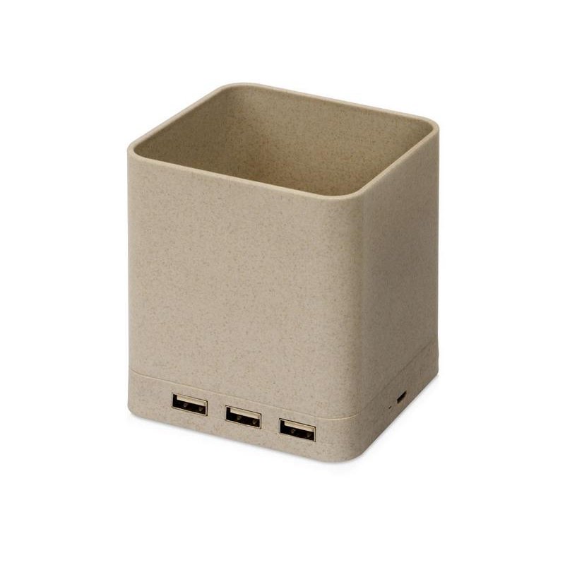 Отличный гаджет для работы или дома, сочетающий в себе подставку для ручек и других мелочей, встроенное отделение для беспроводной зарядки устройств, а также USB-хабна 3 порта. Модуль беспроводной зарядки может также использоваться как подставка для телефона. Хаб удобен для подключения дополнительных устройств к компьютеру или одновременной проводной зарядки ваших гаджетов. Большое пространство для нанесения делает этот товар особенно эффективным инструментом продвижения. Корпус на 50% изготовлен из переработанной пшеничной соломы и на 50% из АБС-пластика.