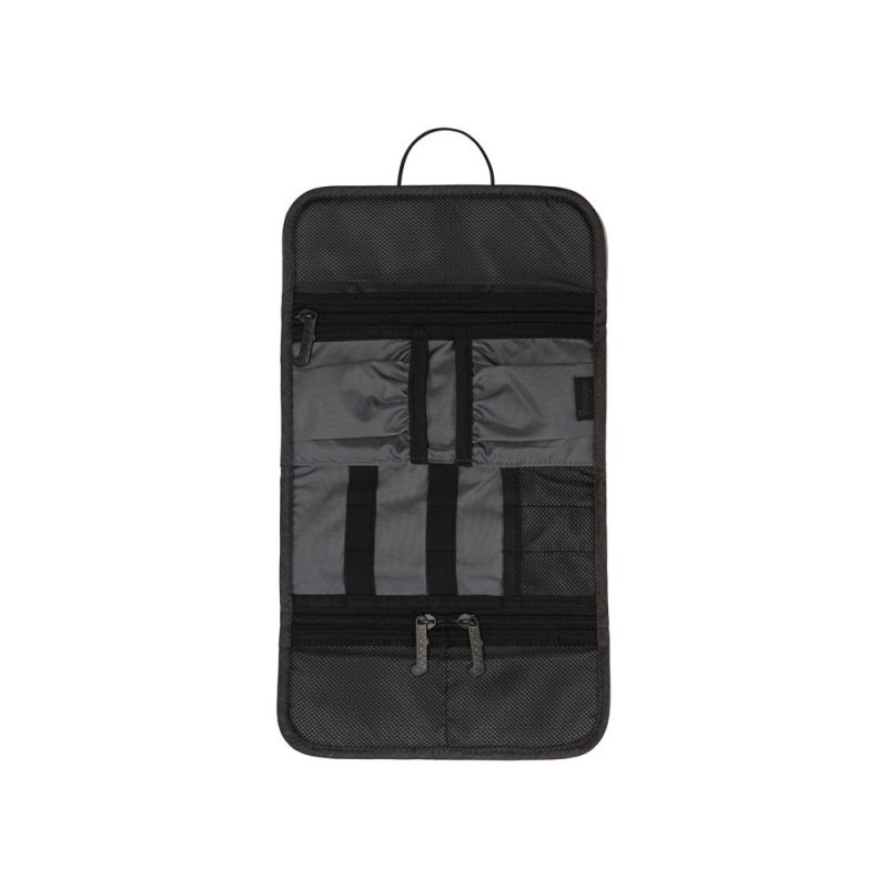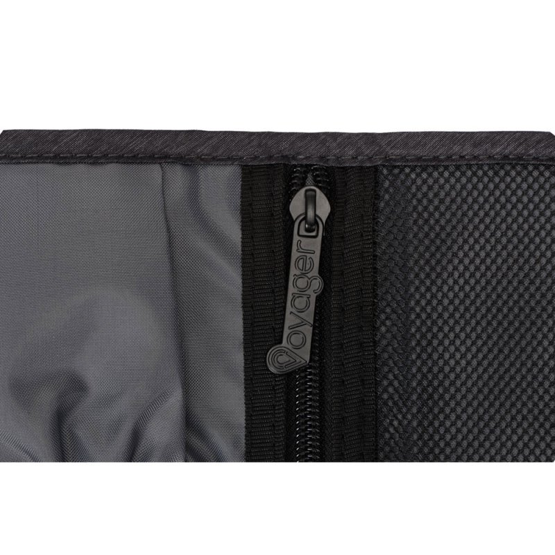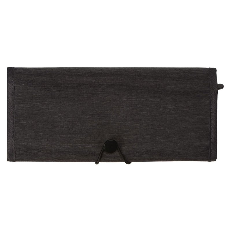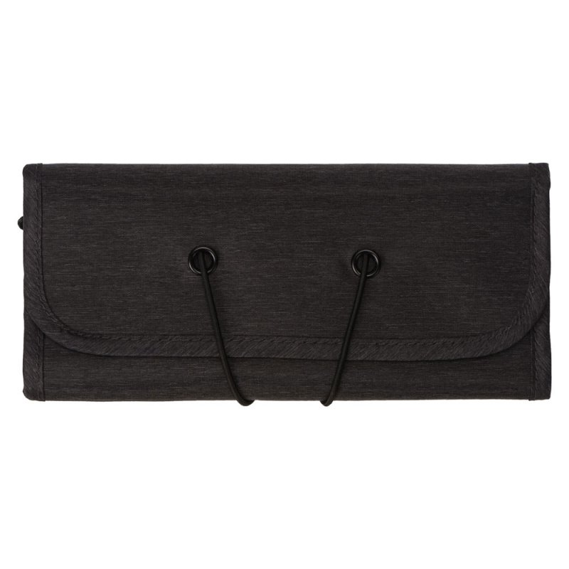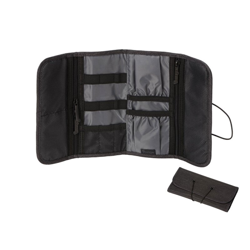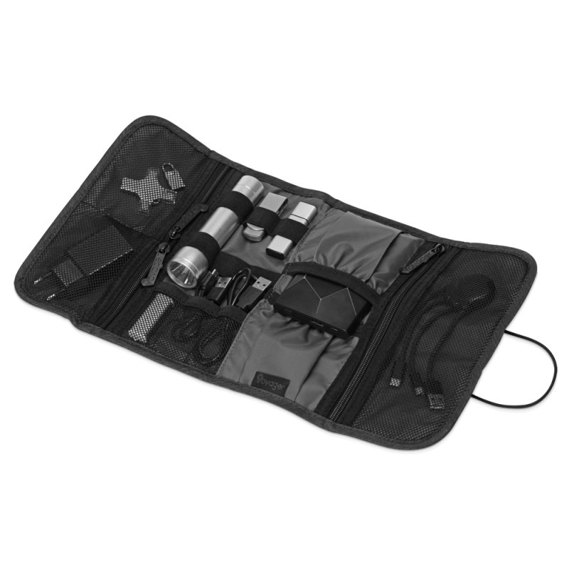 Органайзер District для электроники Voyager с множеством кармашков и отделений позволяет рассортировать девайсы, провода и другие аксессуары для техники удобным вам способом. Органайзер имеет 6 сетчатых кармашков, из них три на молнии, с бегунками, украшенными логотипом бренда. Кроме того, он имеет держатели для проводов и открытые карманы на резинке. Обложка закрывается на резинку, которая зацепляется за круглую пуговицу, и в сложенном виде органайзер весьма компактен, несмотря на свою вместительность. Благодаря форме его можно набить достаточно туго, ведь растягивающаяся резинка на обложке позволяет варьировать степень наполненности органайзера.