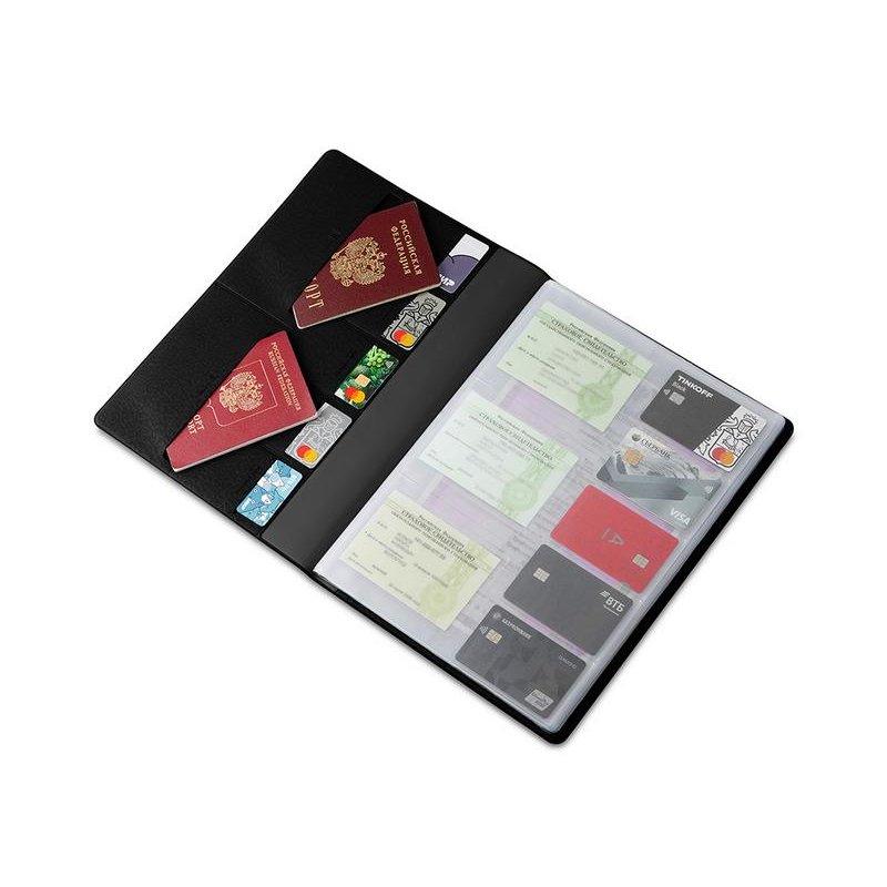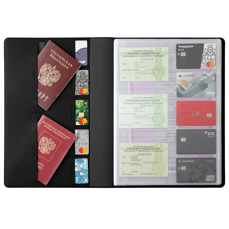 - 6 горизонтальных кармана 10 х 14 см с подписями и иконками, уточняющими тип документа, который можно поместить внутрь