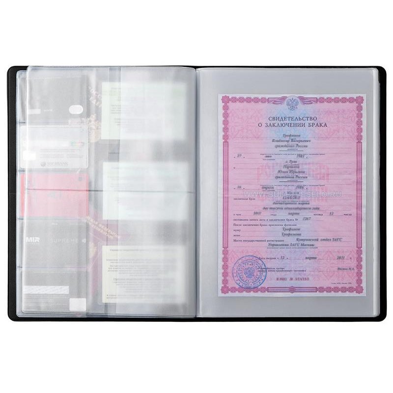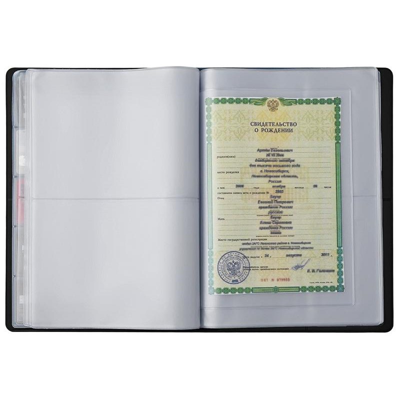 С ним свидетельства о рождении, браке и др. важные документы будут рассортированы и доступны для просмотра, будучи помещенными в прозрачные кармашки из пленки ПВХ.
