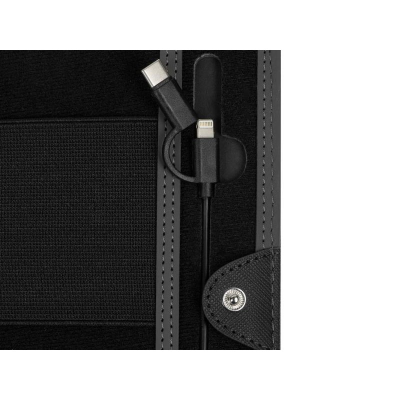 Органайзер закрывается на кнопку, имеет фиксирующие резинки для проводов и других мелочей, а также большой карман, отсек для паспорта и 4 — для карточек. Для проводной зарядки предусмотрен встроенный провод.