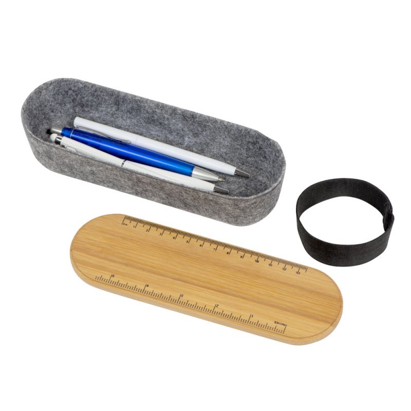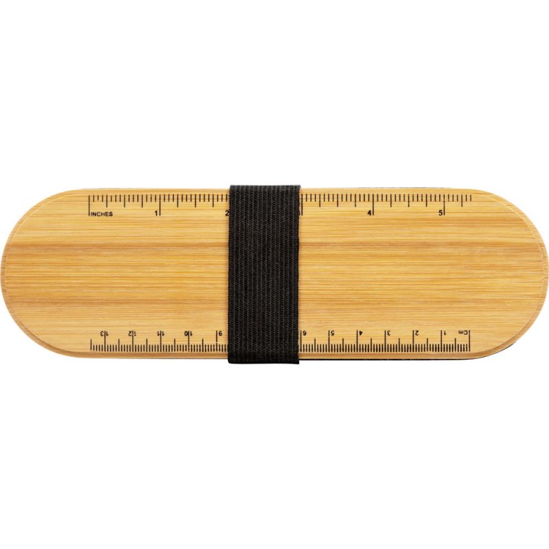 Пенал для ручек и карандашей с бамбуковой крышкой. На крышке есть линейка с несколькими метрическими системами, с оборотной стороны крышки находится выемка, которая может служить подставкой для телефона.