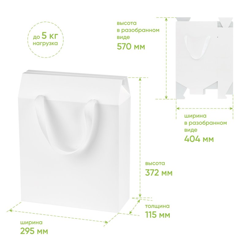 Универсальный пакет – коробка выполнен в белом цвете с ручками из рапсовой ленты. Вместительный и изящный, он станет хорошим решением упаковки подарка.