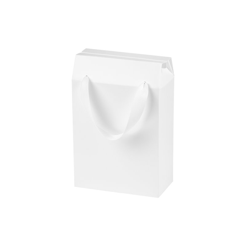 Универсальный пакет – коробка небольшого размера, тем не менее, вмещает различные вариации подарочных наборов. Выполнен в праздничном белом цвете с ручками из репсовой ленты. Станет хорошей упаковкой для подарочного набора.