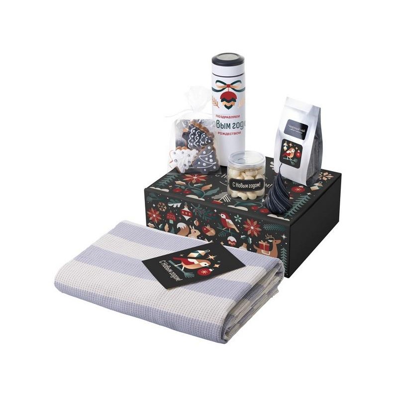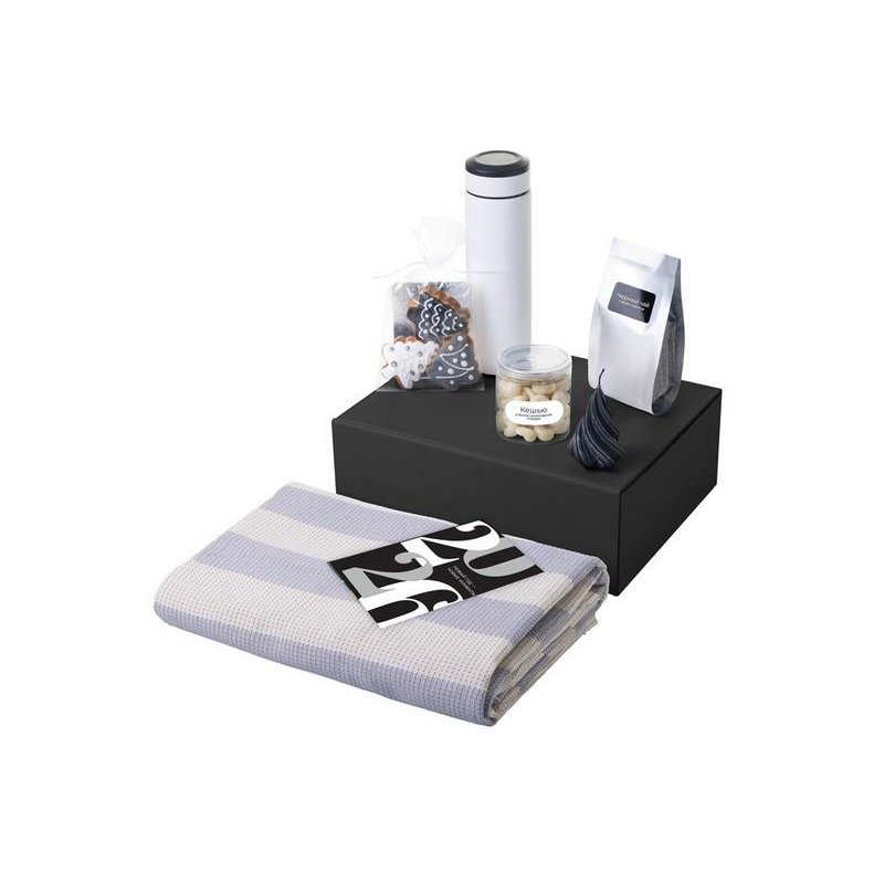 - Материал товара:плед - 100% хлопок, мешок - нетканый материал (спанбонд), термос - нержавеющая cталь с покрытием soft-touch, открытка - бумага