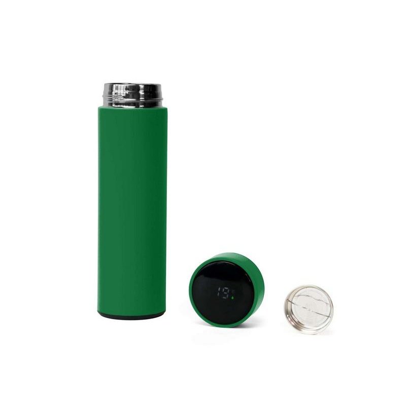 Термос выполнен из нержавеющей стали и покрыт цветным soft-touch покрытием. Его особенность — инновационная крышка со встроенным термометром и LED-дисплеем, который отображает температуру напитка внутри.