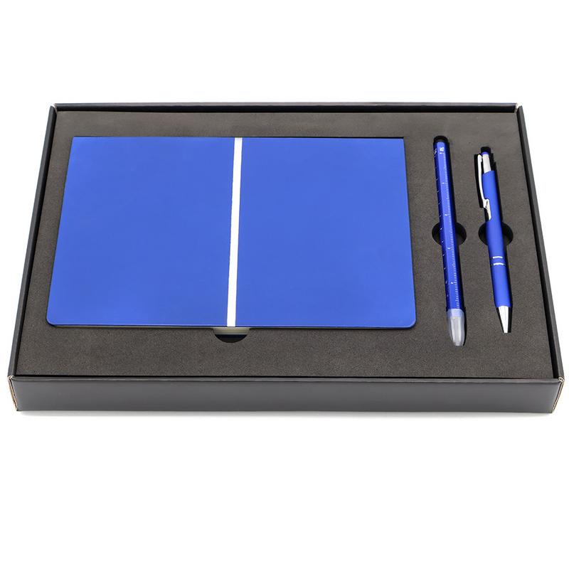 Подарочный набор в стильной цветной картонной коробке черного цвета (крышкой-дно). Внутри на аккуратном ложементе располагаются ежедневник, ручка металлическая, и вечный карандаш.