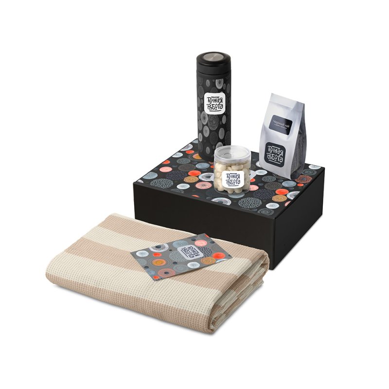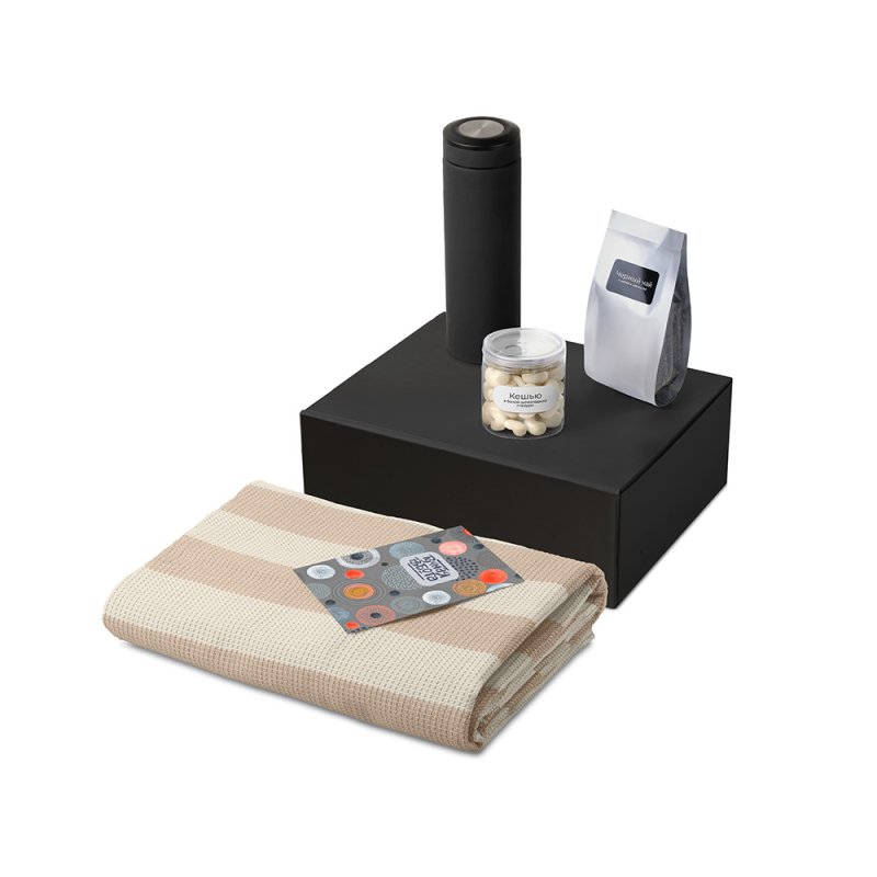 - Материал товара:плед - 100% хлопок, термос - нержаваеющая сталь с покрытием soft-touch, чай - пластик, мешок - нетканый материал (спанбонд), коробка - картон