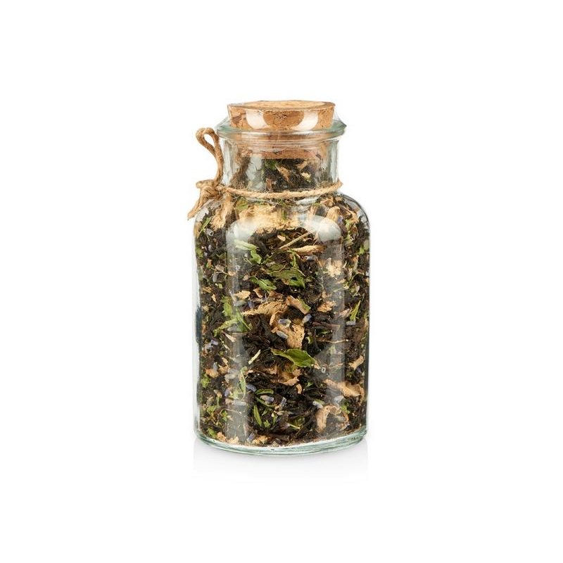 Состав: чай чёрный с имбирём и соком имбиря (чай чёрный байховый крупнолистовой, кусочки имбиря, сок имбиря), мята сушёная, лаванда.