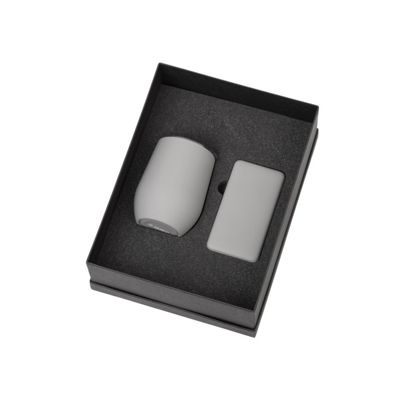 - Материал товара:повербанк- пластик с покрытием soft-touch, термокружка- нержавеющая cталь с покрытием soft-touch