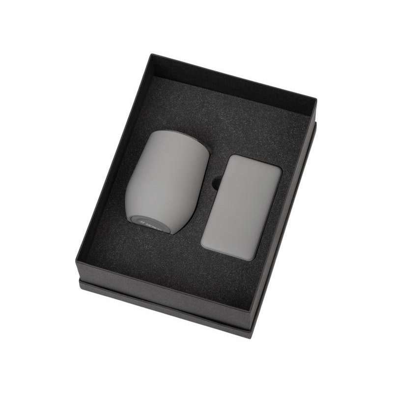 - Материал товара:повербанк- пластик с покрытием soft-touch, термокружка- нержавеющая cталь с покрытием soft-touch